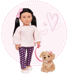 Each doll comes with its own 6″ plush puppy. Plus, the included accessories help boost imagination and teach kids how to care for a pet.