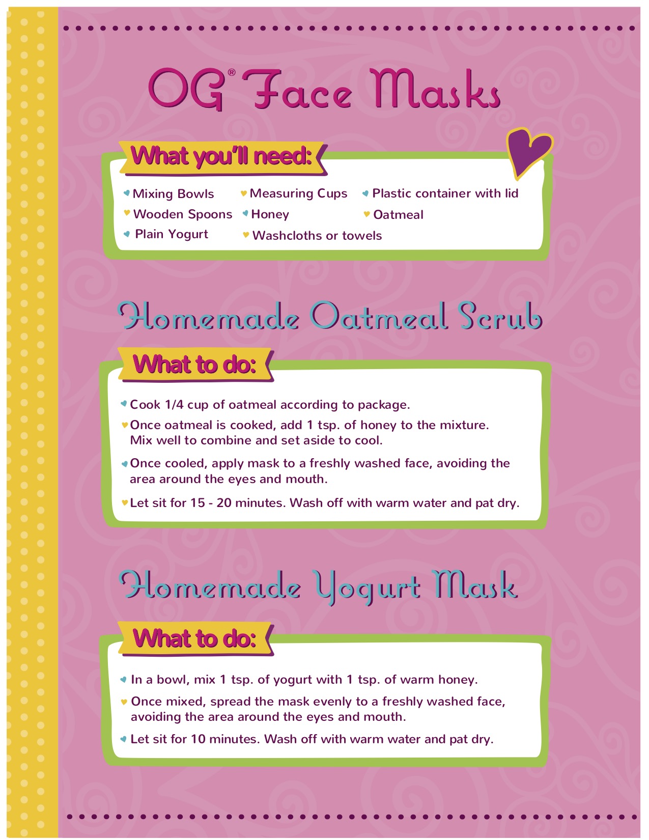 Plan the perfect spa day by making homemade face masks. Choose between an oatmeal scrub or a yogurt mask in our OG Spa Guide and let the pampering begin!