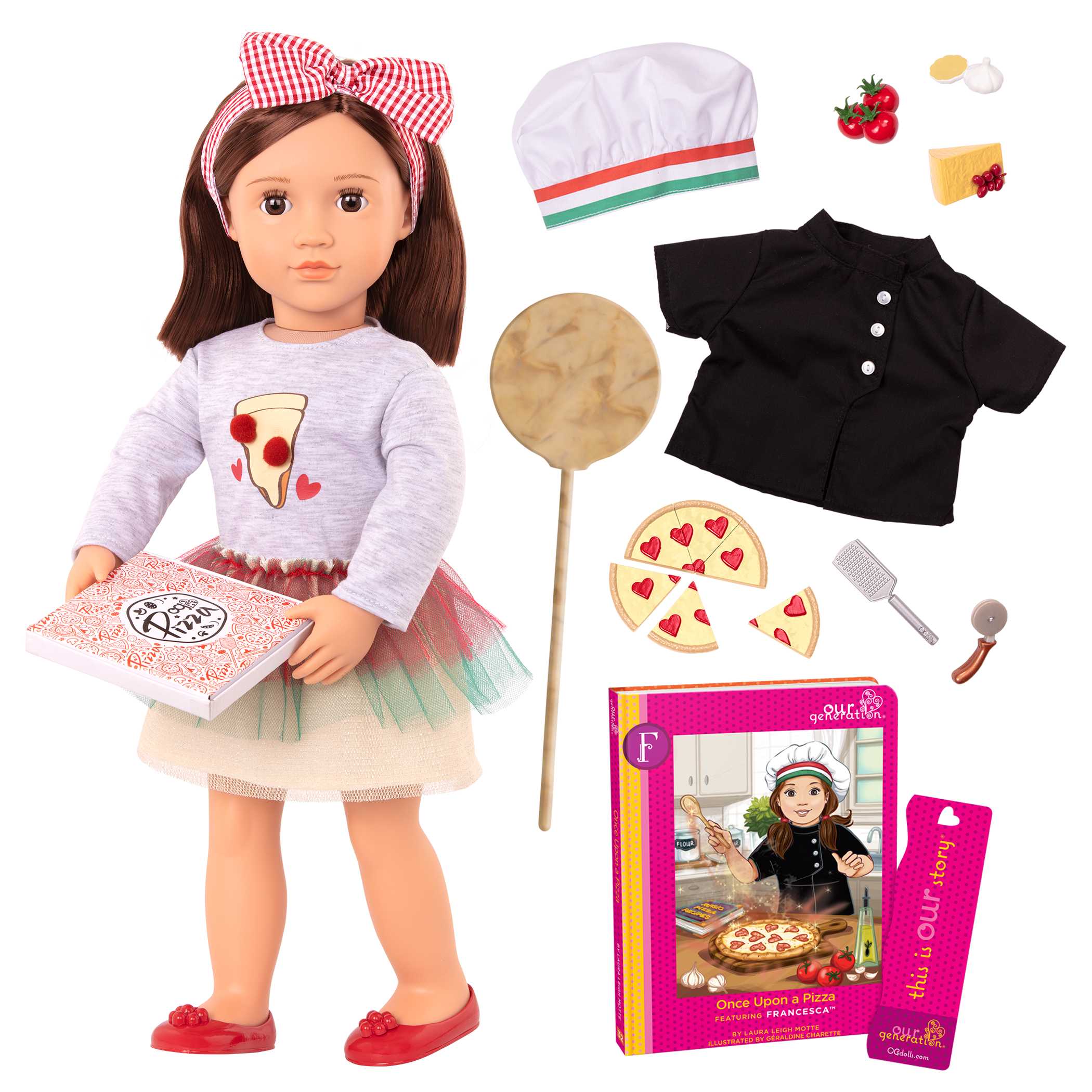 Discover pizza-making magic with Francesca, 2 outfits, and an illustrated storybook to recreate her adventures.