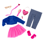 • Includes: doll, leotard, 2 skirts, denim-style pants, tights, cardigan, tiara, necklace, heart-shaped purse, 2 pairs of shoes, hair extension, hairbrush, glasses, pretend nail polish, and style guide.