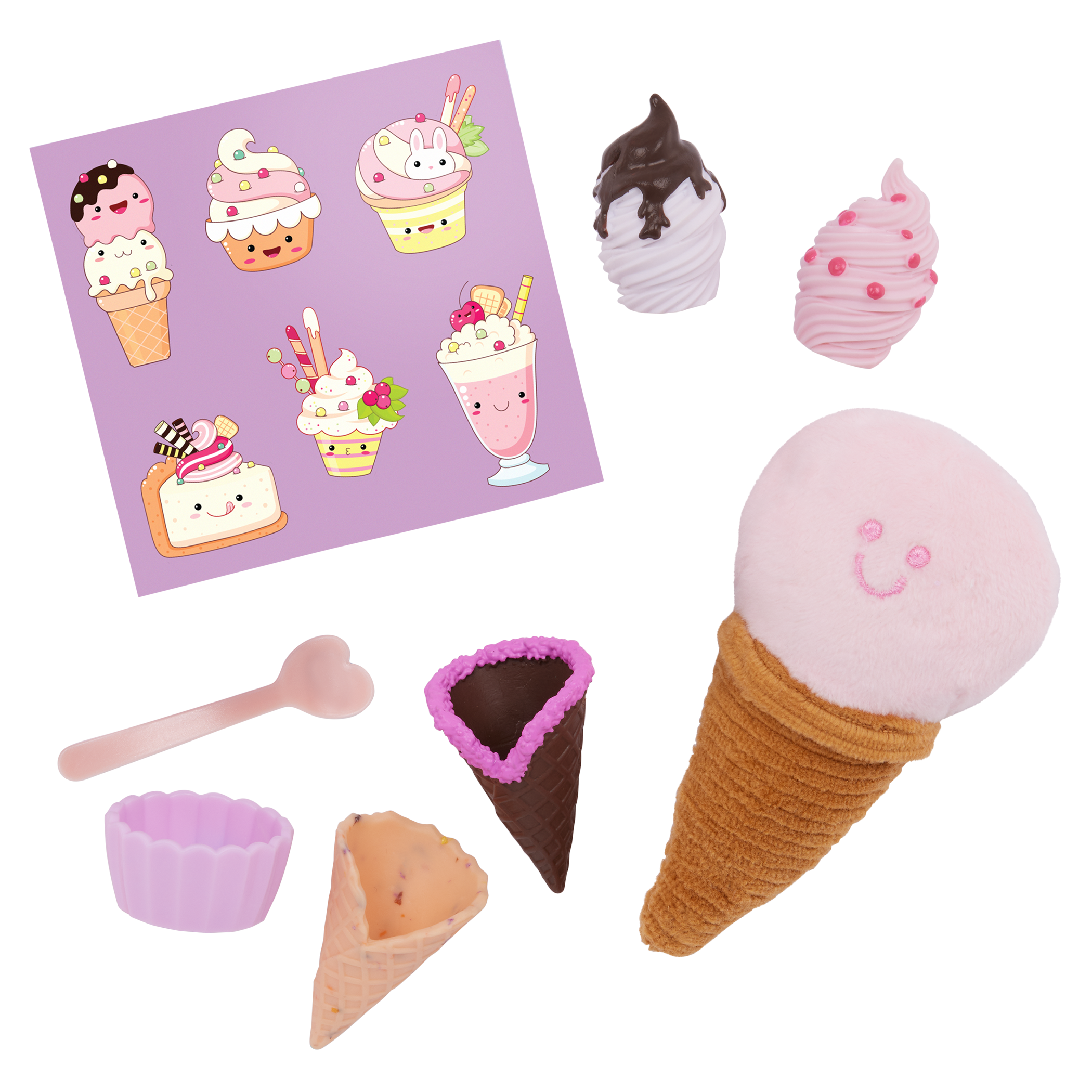 - Includes: 18-inch doll, a dress with a rainbow skirt and hooded top, sparkly tights, a pair of undies, bright purple shoes, 2 pom pom hair elastics, 2 waffle cones with 2 swirls of ice cream that fit inside, a bowl, a spoon, a sheet of real stickers, and