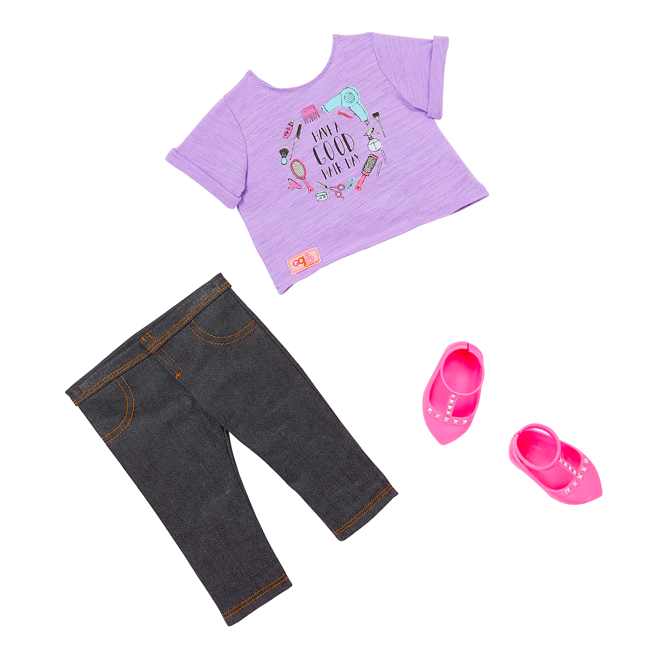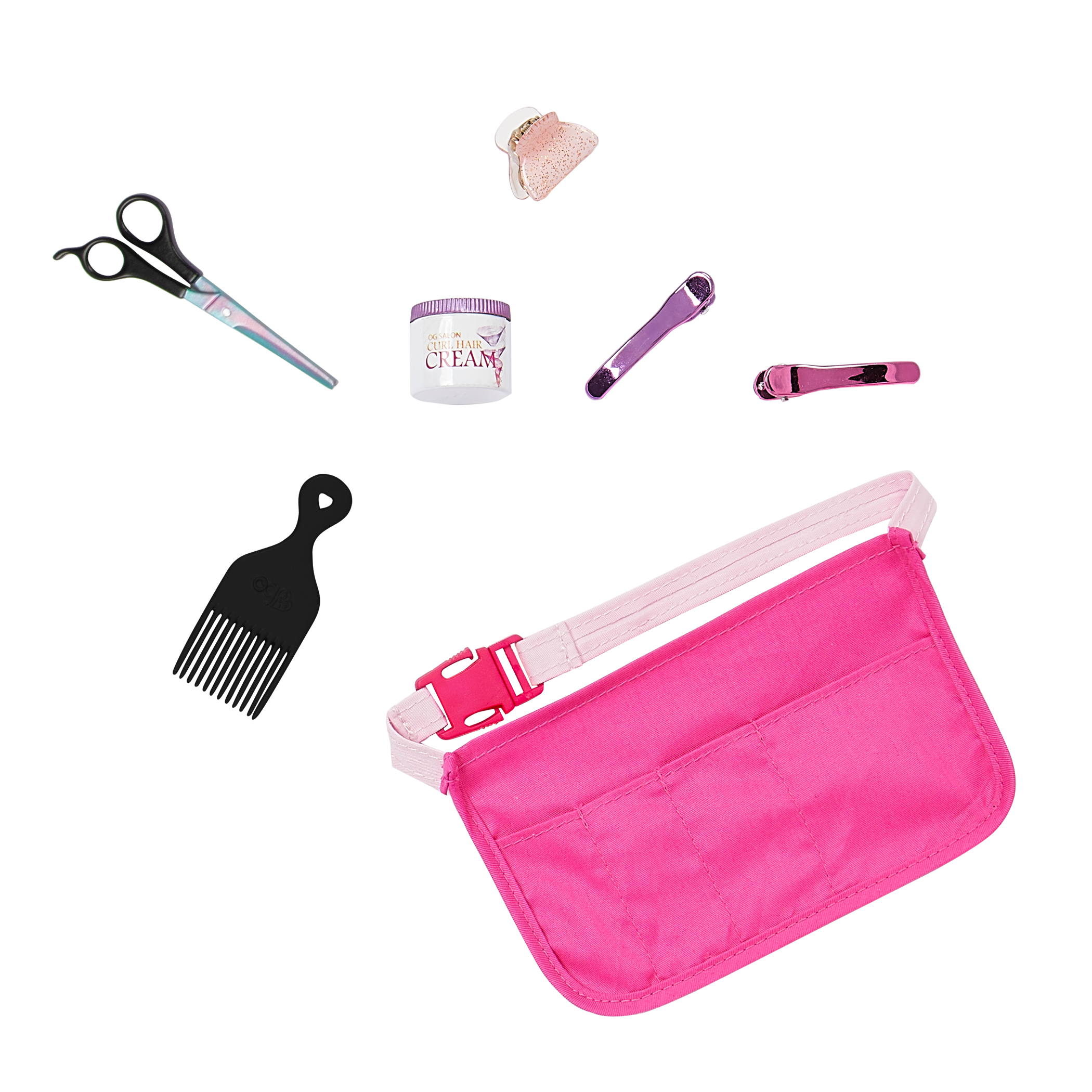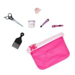 - Includes: 18-inch doll, top with colorful text, denim-style pants, undies, shoes, stylist apron, hair pick, cream jar, 3 hair clips, and pretend scissors.