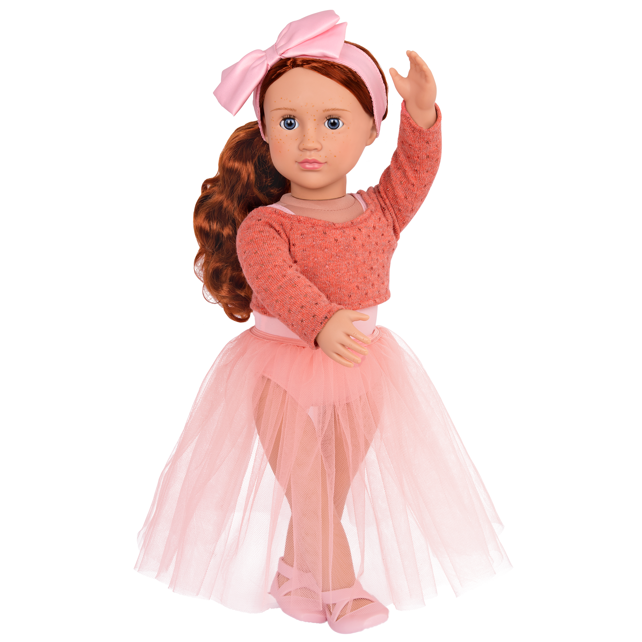 Put on a big performance with the sweet Our Generation doll Aubrie! This 18-inch ballerina has bright blue eyes that open and close, adorable freckles, and long, wavy red hair that’s lots of fun to brush and style! Aubrie is all ready for ballet. She is wearing a cozy orange sweater over her pink leotard, a long, removable tulle skirt, matching ballet shoes, and a large hair bow that highlights her playful spirit! Aubrie’s ballet outfit has easy-open closures to quickly put on and remove, so you can mix, match, and have extra fun dressing her in more fun looks after the recital! (Additional outfits sold separately)