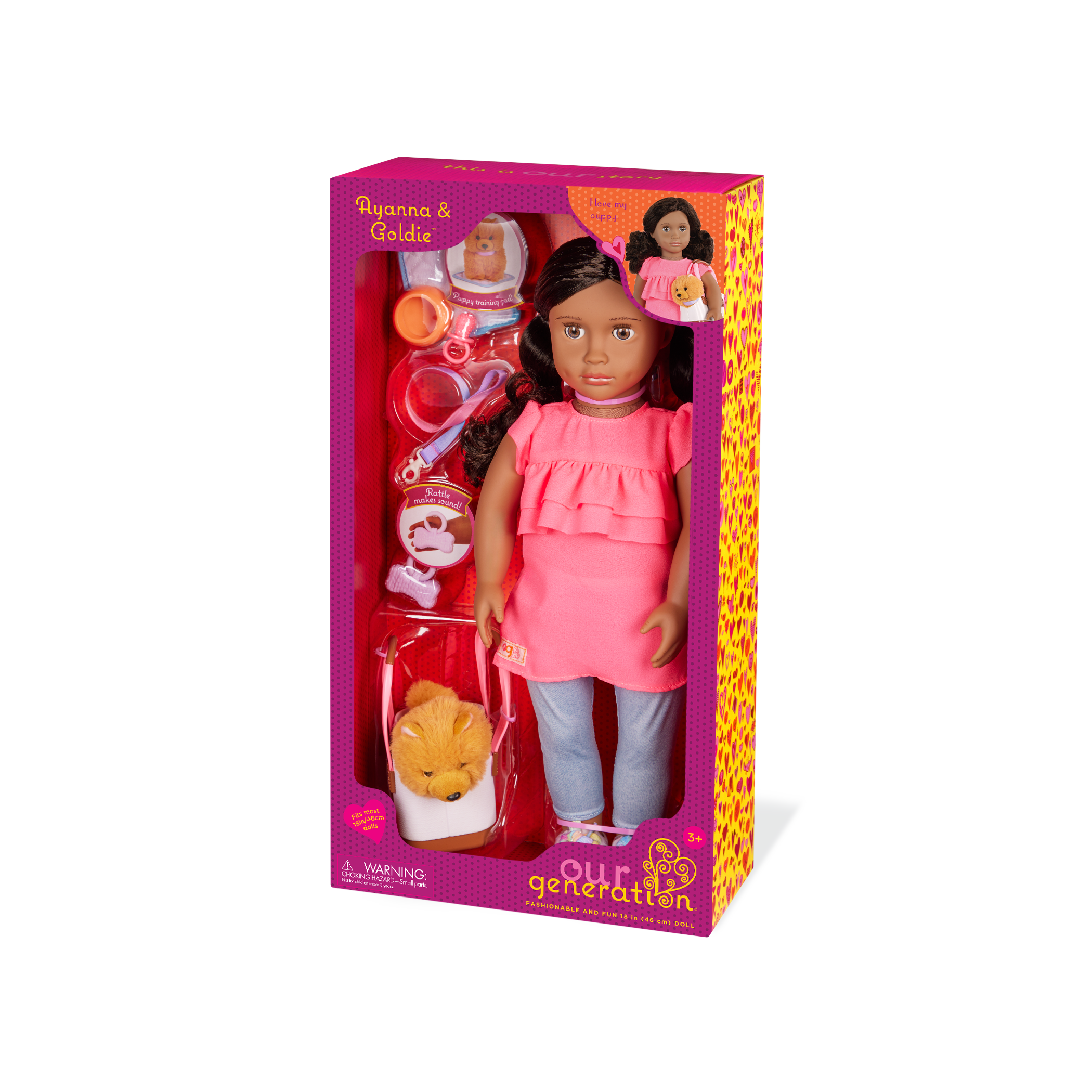 - 18-inch Doll & Pet Set: Our Generation 18-inch doll Ayanna and her pet puppy Goldie spark friendship and fun for animal fans!