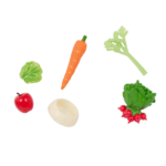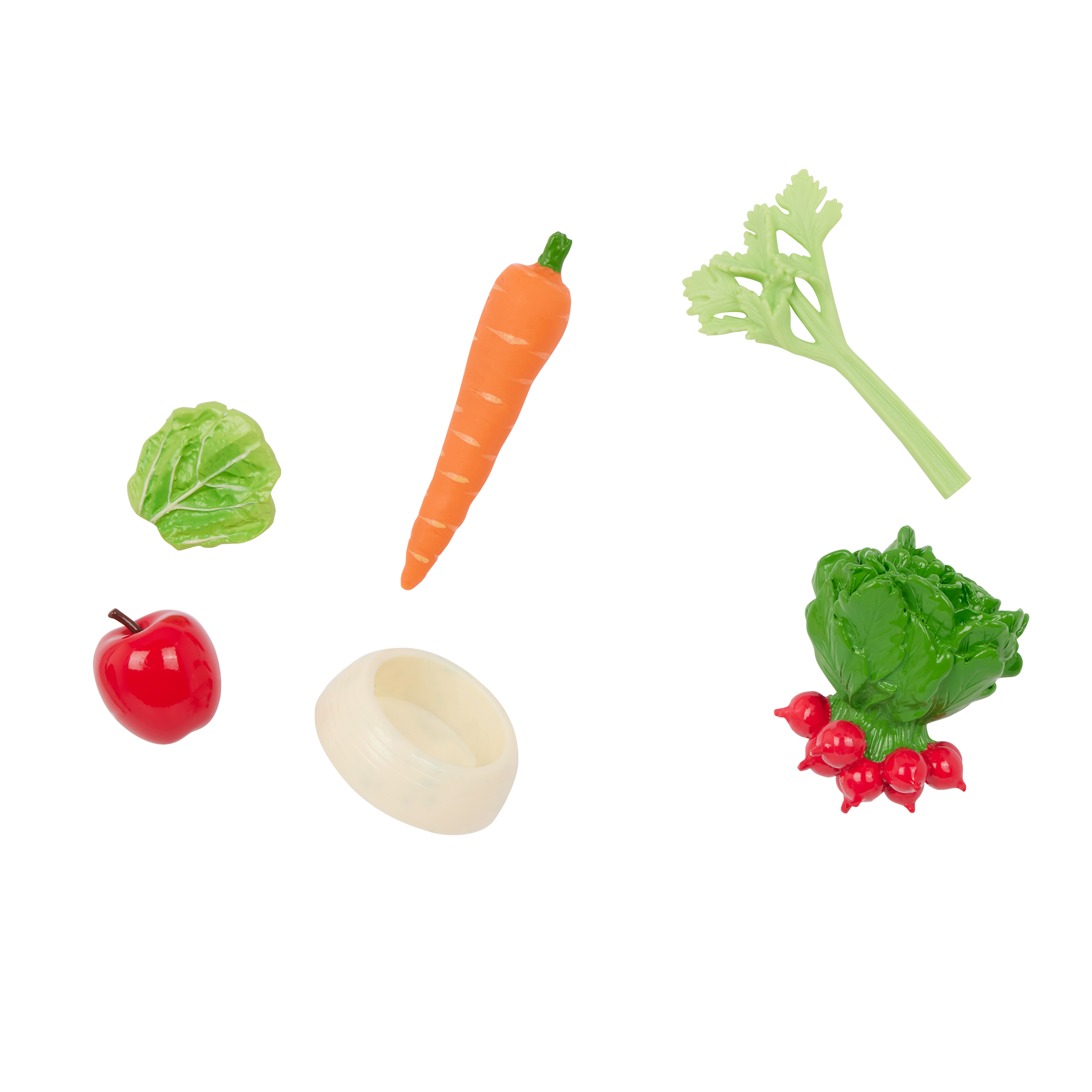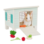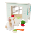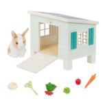 • Includes: Rabbit hutch, a plush bunny, a food bowl, a lettuce leaf, a carrot, a stalk of celery, an apple, and a bundle of radishes.