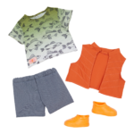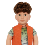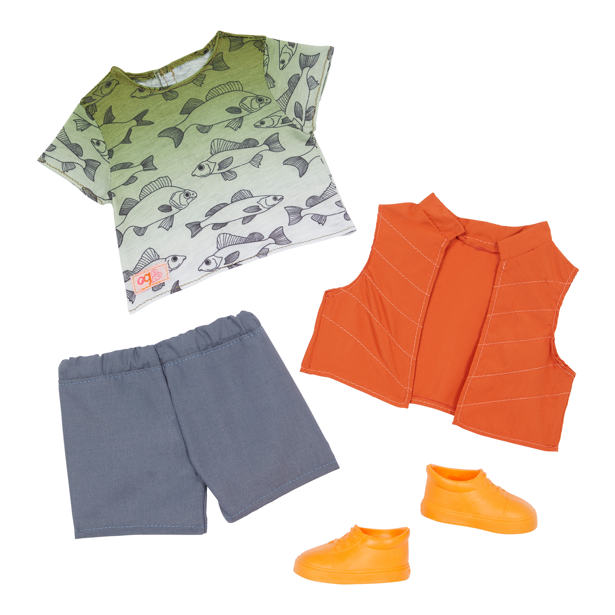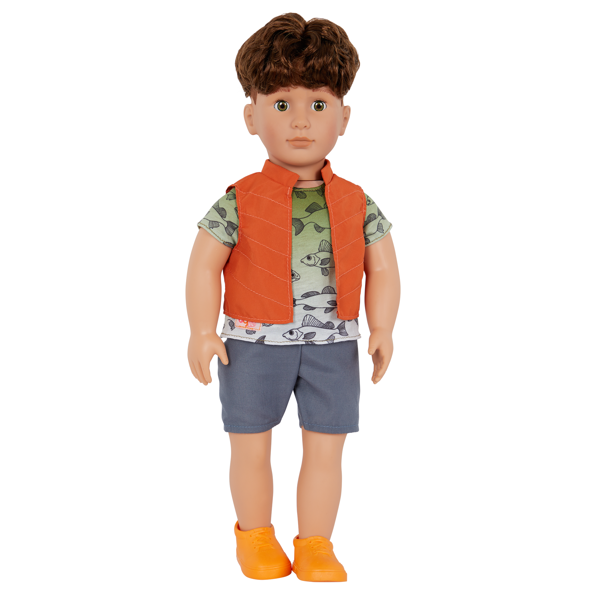 Team up with Our Generation 18-inch boy doll Camden and explore outdoor adventures together - camping is oh-fish-cially his favorite activity! He has hazel eyes that open and close with short, wavy brown hair, a huggable soft body, and can rotate his neck, arms, and legs to easily change outfits. Camden is ready to explore the wild and meet friendly critters. He arrives wearing a fun fish-print T-shirt, shorts, a travel vest, and bright orange shoes. And his outfit features easy-open closures to quickly put on and remove, so you can discover lots of cool new looks to give Camden on every journey!