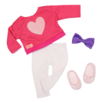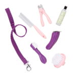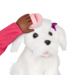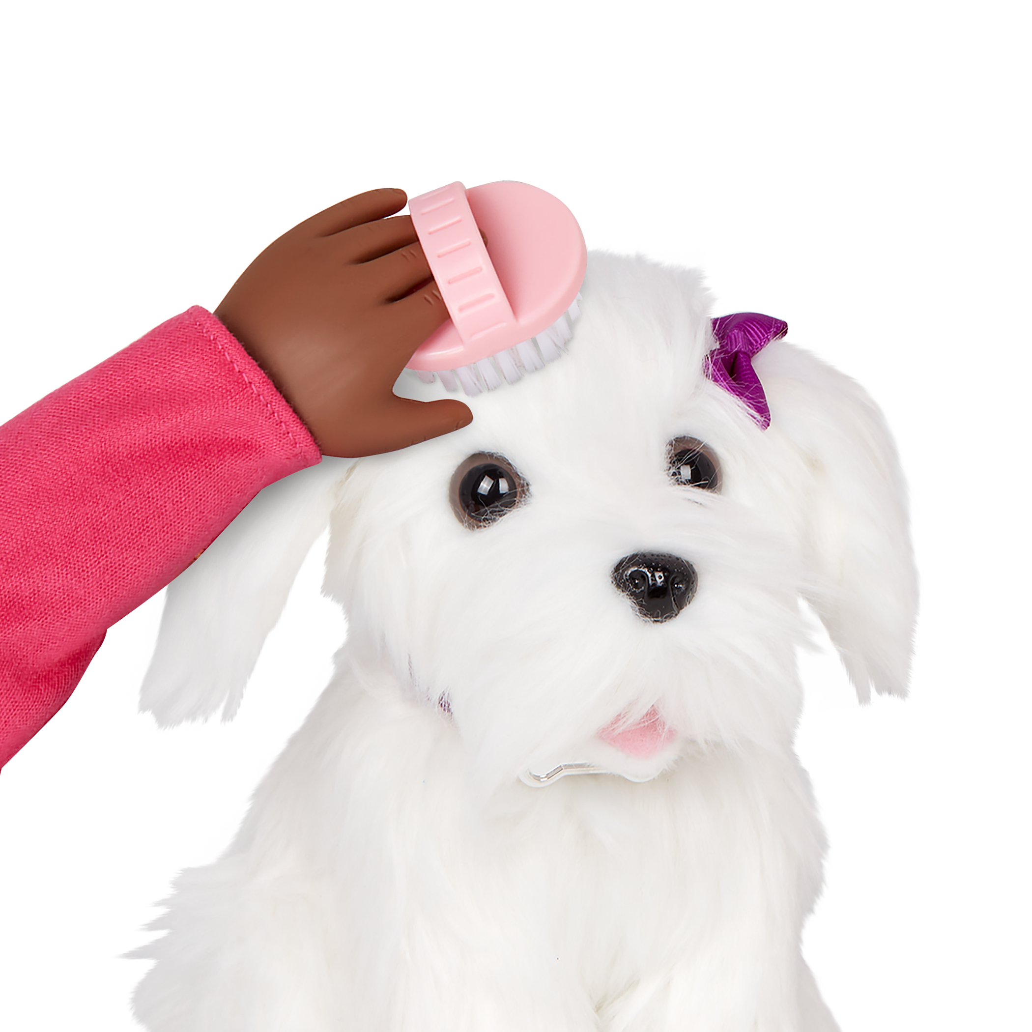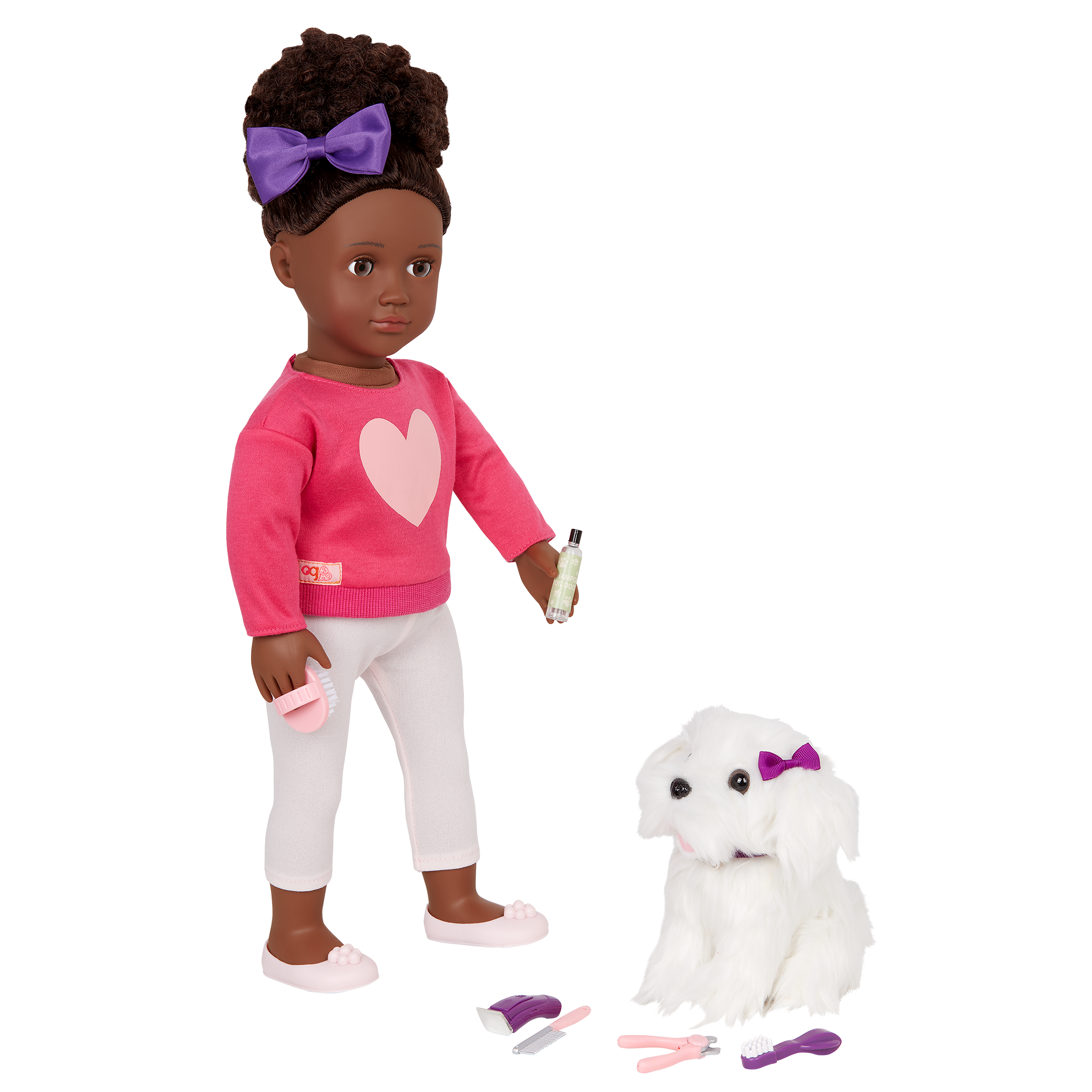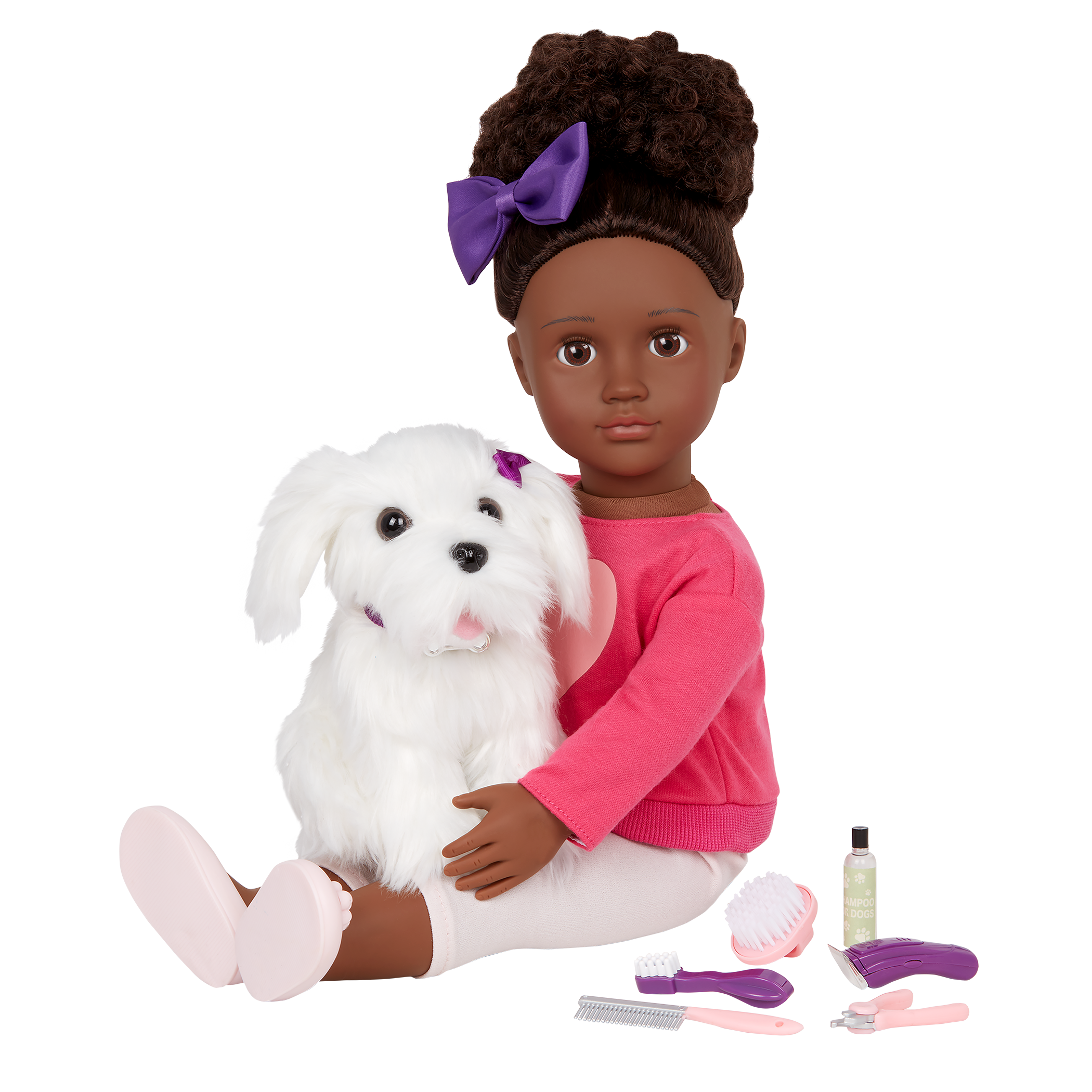• Includes: doll, heart-print top, leggings, a hair bow, a pair of undies, shoes, 6-inch Maltese dog plush with a hair bow, removable collar, attachable leash, nail clipper, hair clipper, a bottle of shampoo, toothbrush, comb, and a grooming brush.