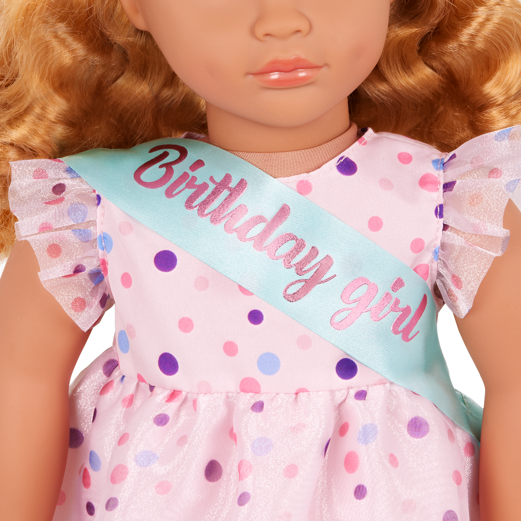 - Includes: 18-inch doll, confetti-print dress, a pair of undies, tiara headband, birthday girl sash, 2 balloons, and shoes.