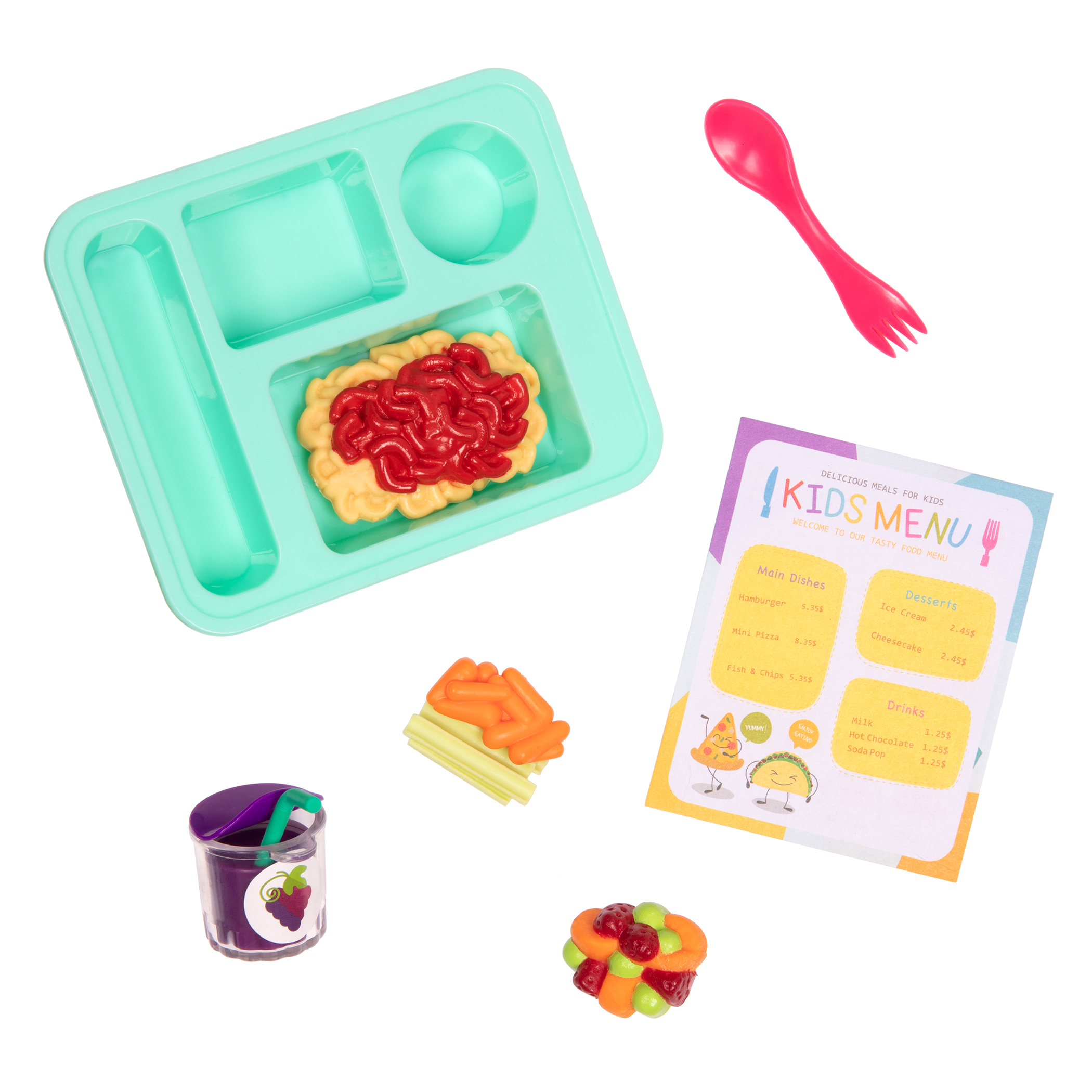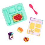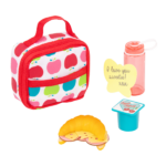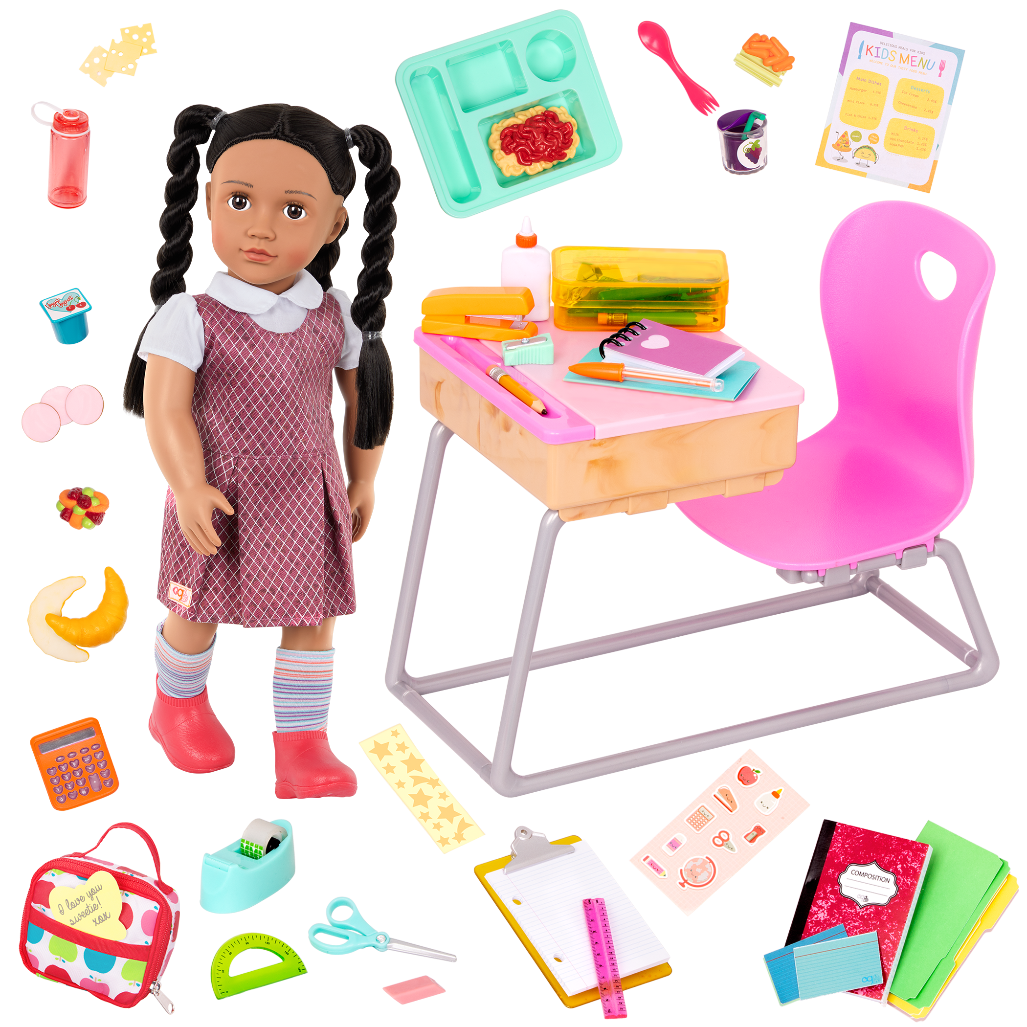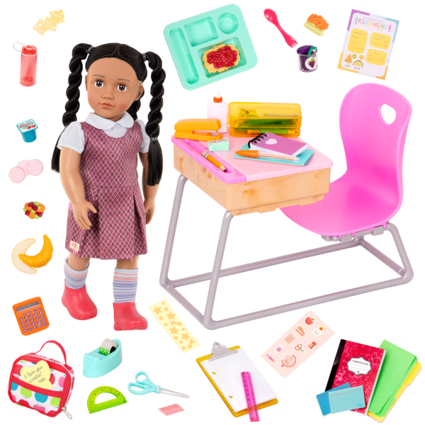 • Includes: Doll, school desk with opening front, stickers, lunch bag, cafeteria tray, play food items, and school supplies.