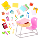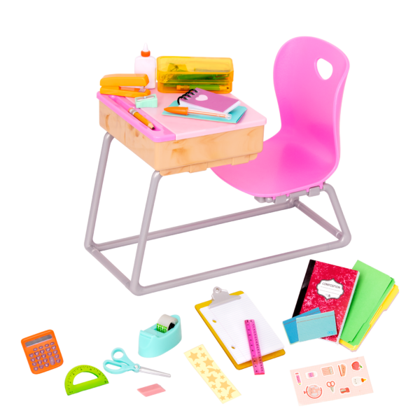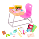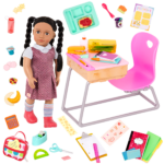 • 61-piece School Bundle: Get ready for school day play with Our Generation doll Frederika, the Flying Colors desk set, and class accessories!