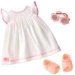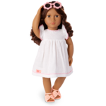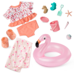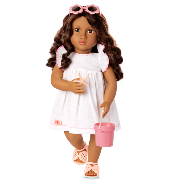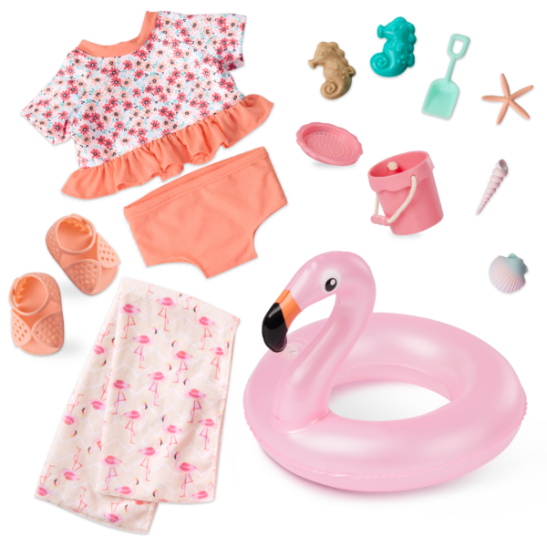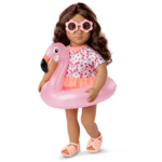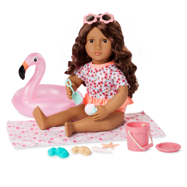 • Includes: Posable 18-inch doll, swimsuit, floral sunglasses, a cute sundress, a pair of undies, peep-toe sandals, towel, an inflatable pool float, a sand mold with insert, 3 seashells, a bucket with sand sifter, shovel, storybook, and bookmark.