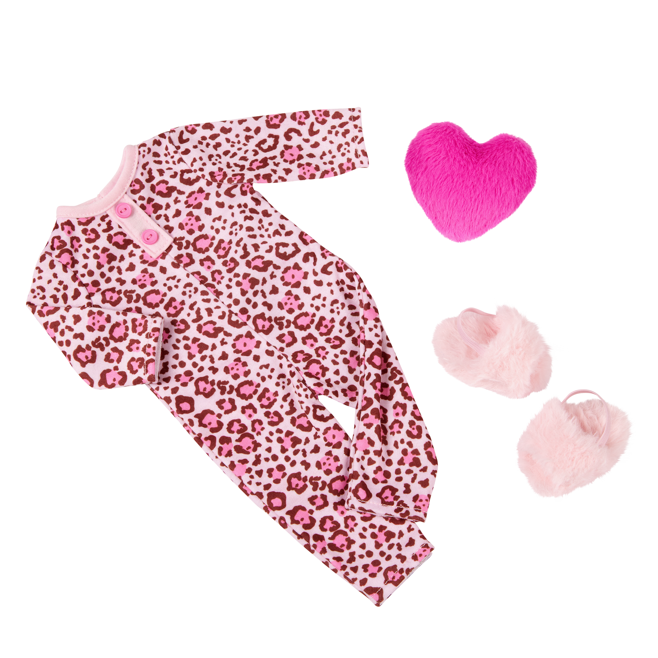 - Child-Friendly Fashion: Gracia comes with a pajama onesie in a pink leopard print, a pair of undies, a bright pink heart plush pillow, and fluffy slippers to go from bed to the breakfast table.