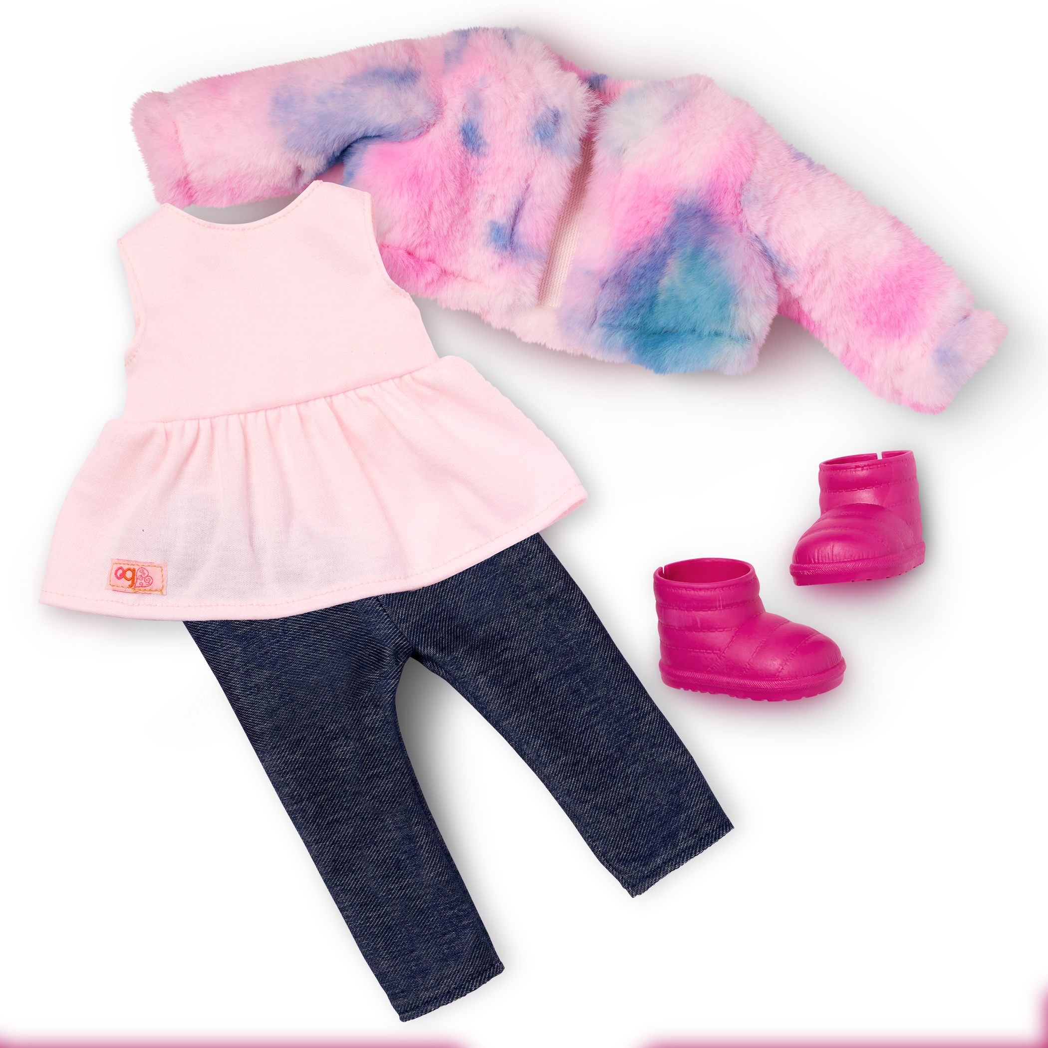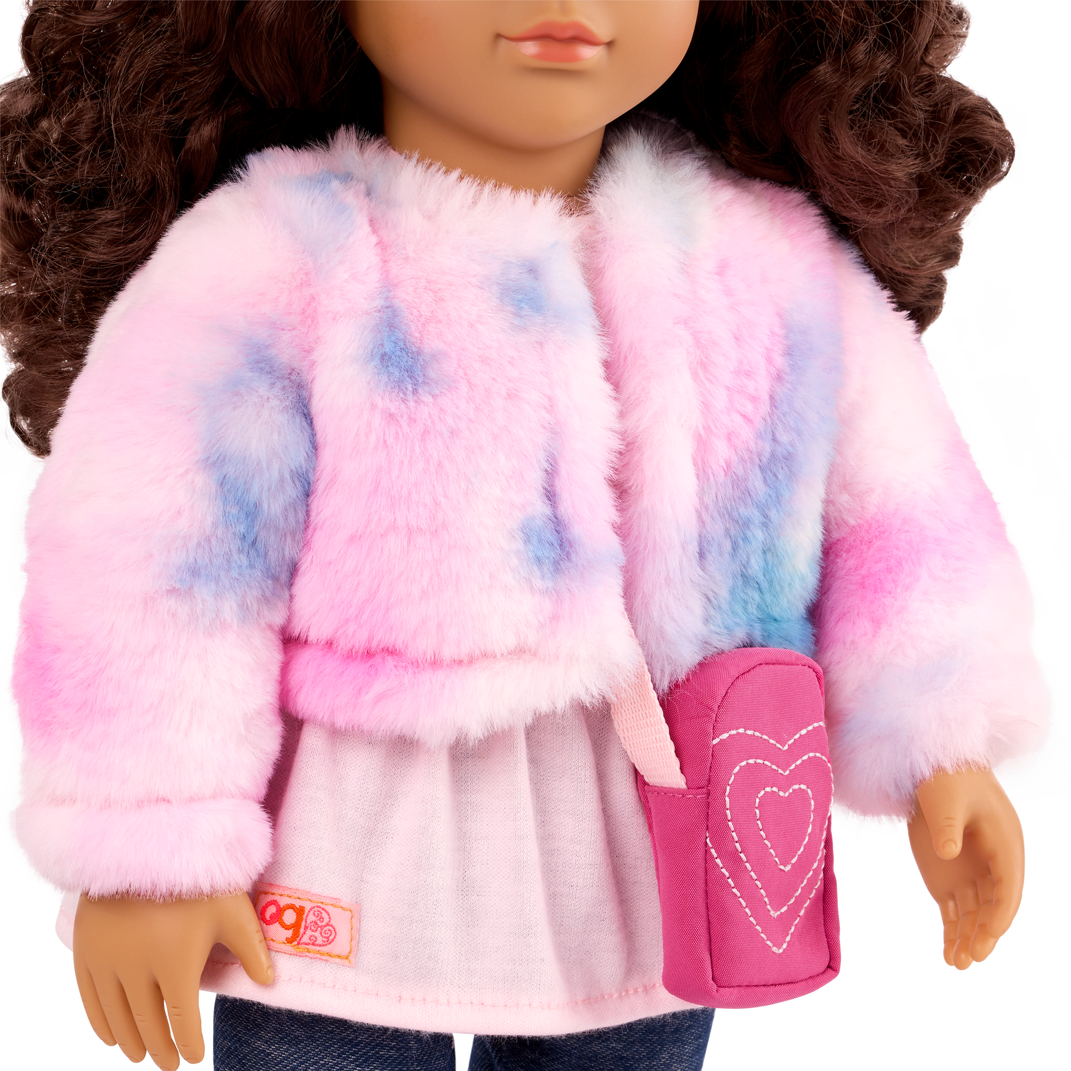 - Includes: 18″ doll, a 6″ Pomeranian dog plush, collar, attachable leash, a pink top with a ruffled hem, tie-dye jacket, denim-style leggings, a pair of undies, crossbody bag, shoes, a drink cup with lid, a bag of treats, a bone toy and a bag dispenser.
