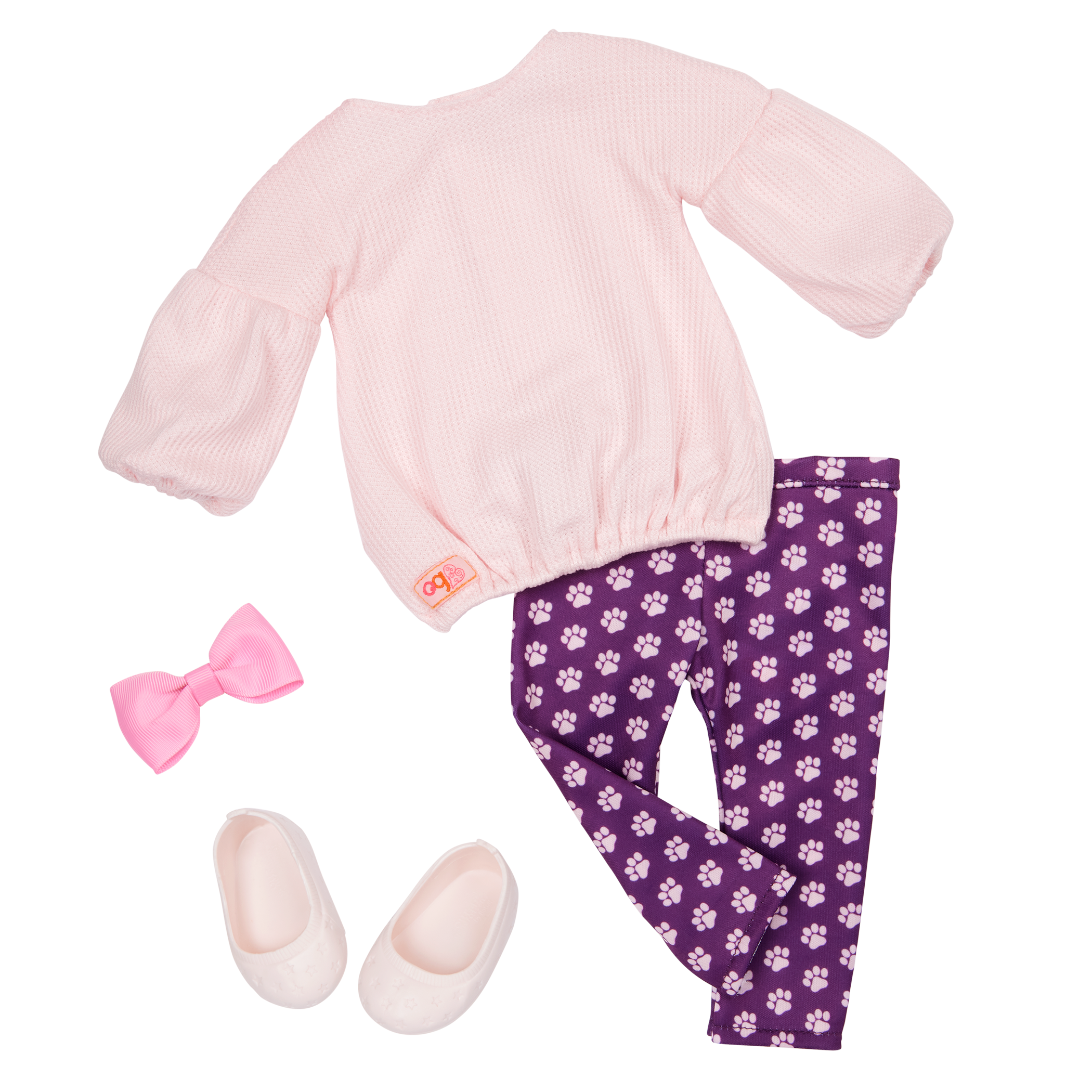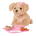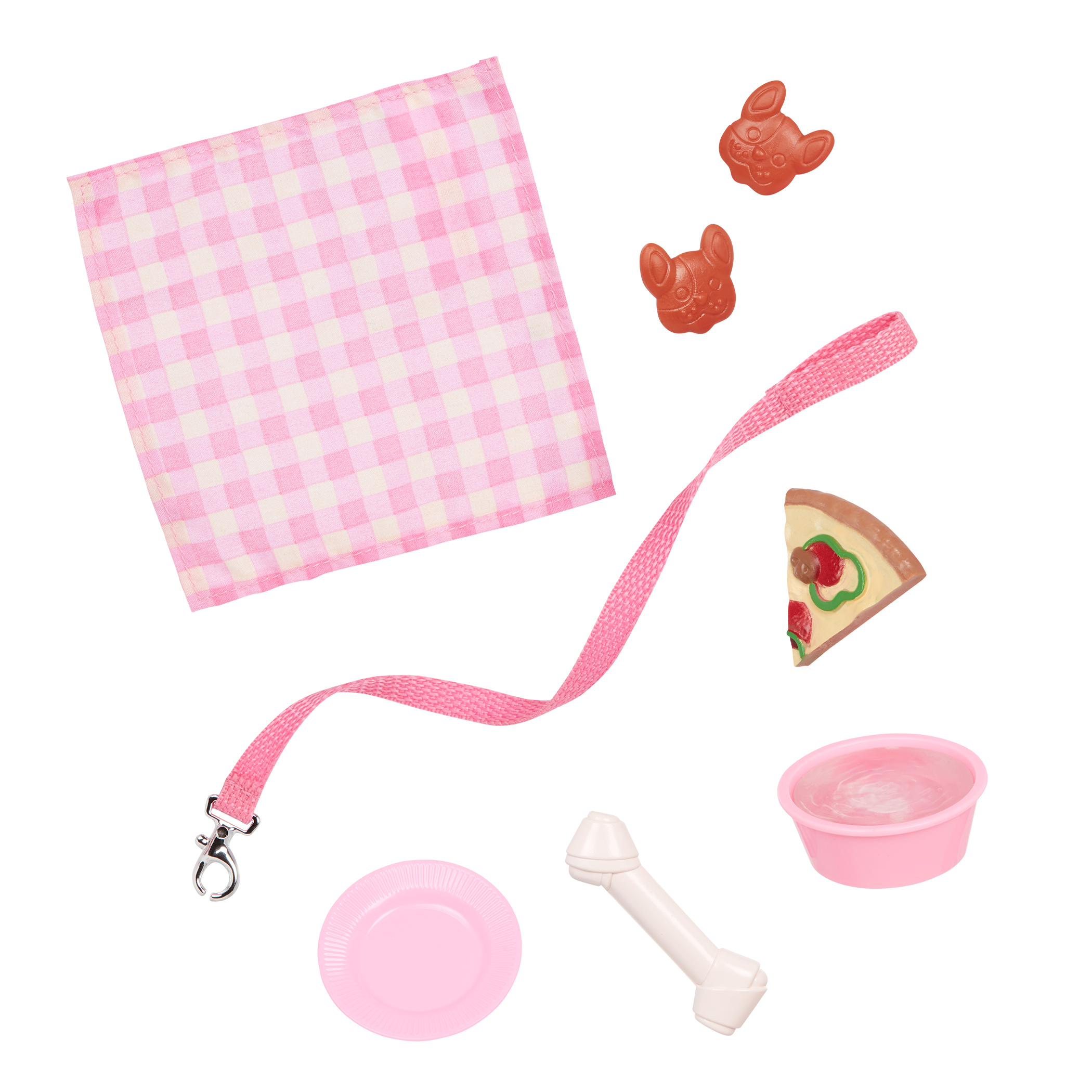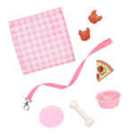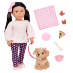 • Includes: doll, top, hair bow, paw-print leggings, a pair of undies, shoes, 6-inch Labradoodle dog plush, collar, attachable leash, a slice of pizza, 2 dog treats, picnic blanket, a plate, food bowl, and toy bone.