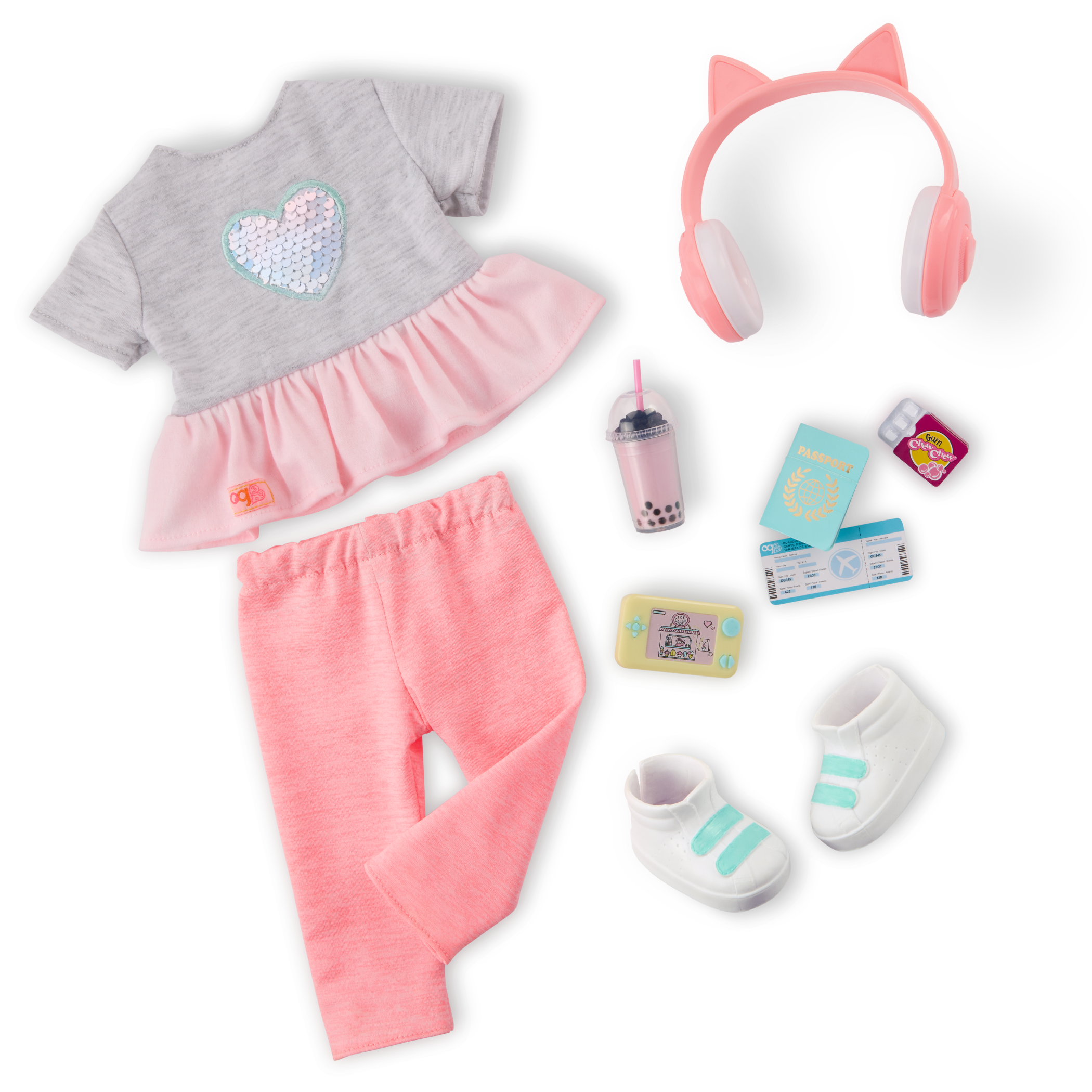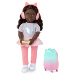 • Includes: 18-inch doll, a flip-sequin top, pink pants, a pair of undies, running shoes, a luggage and headphones with cute cat ears, a passport, boarding pass, pretend video game console, travel drink, and a pack of gum.