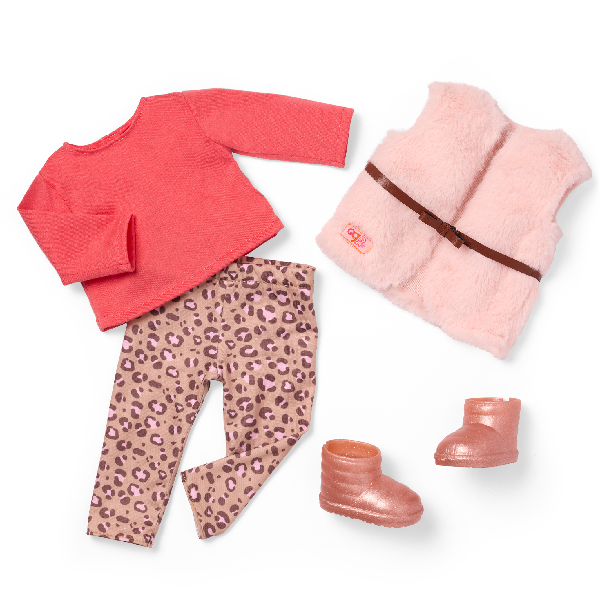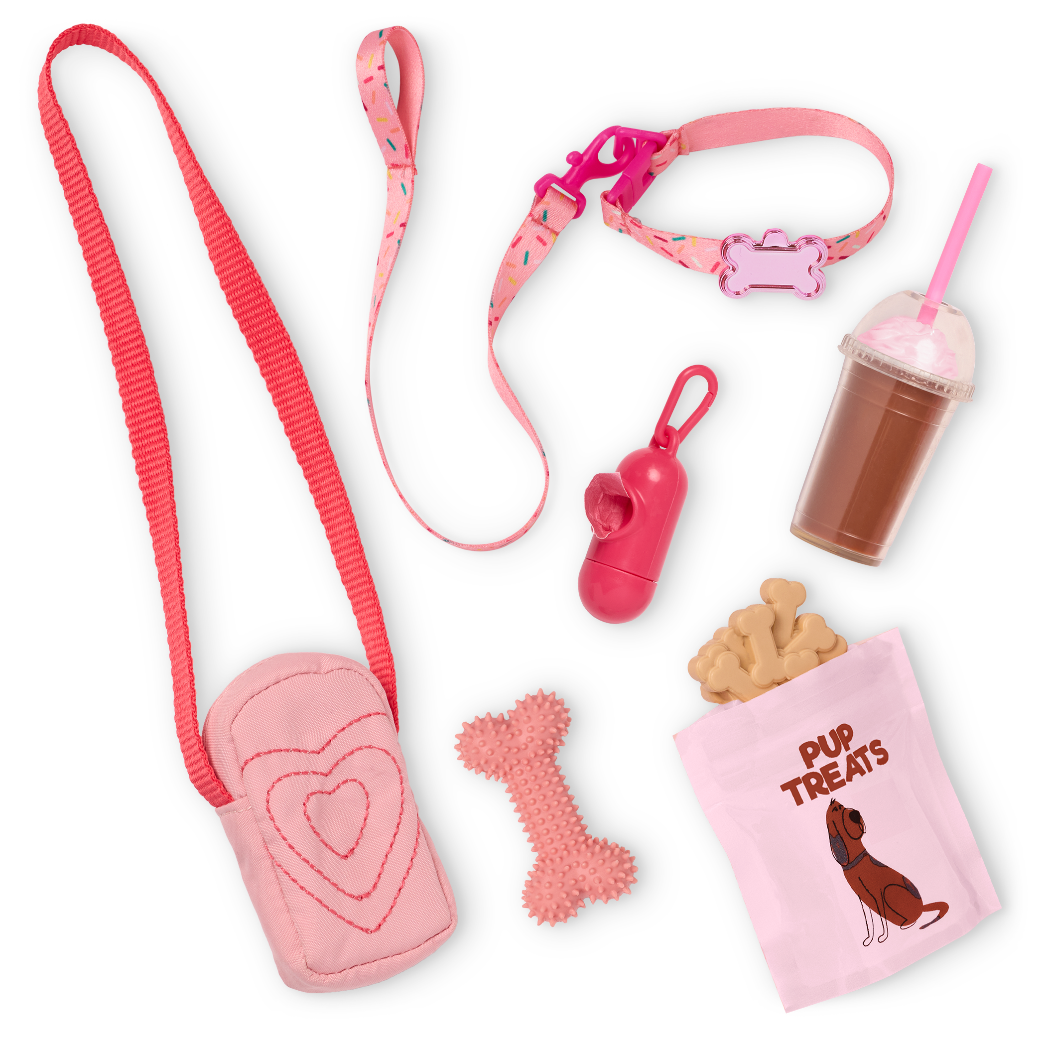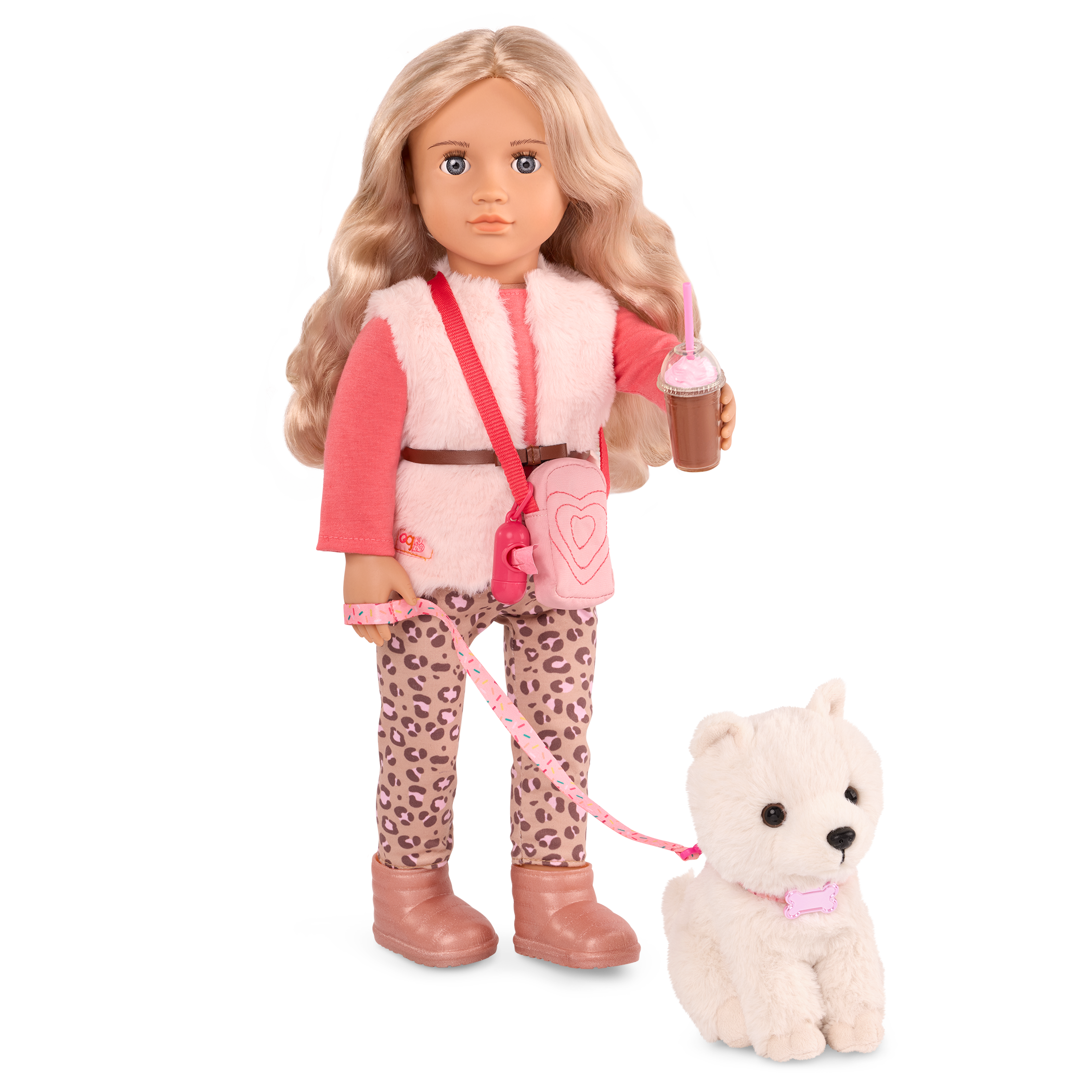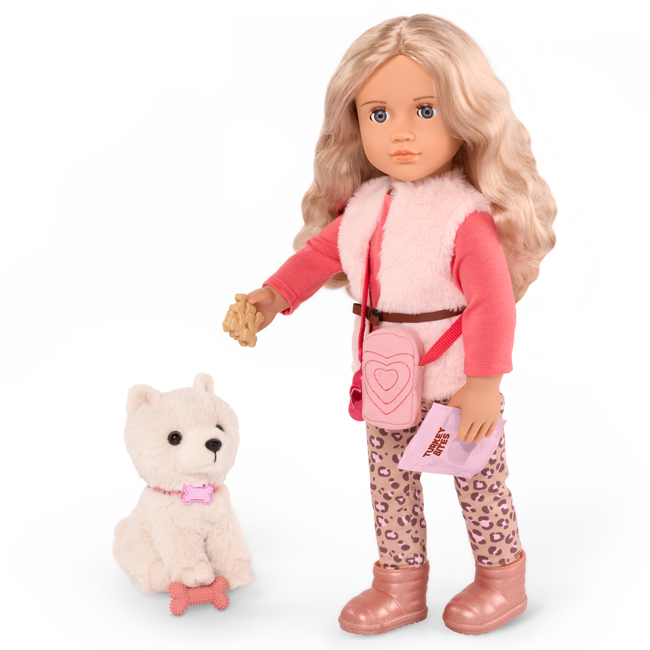 - Includes: 18″ doll, 6″ Shih Tzu dog plush with collar, an attachable leash, a sweater, a faux-fur vest, leopard-print leggings, a pair of undies, a crossbody bag, shoes, a drink cup with a removable lid, dog treats, a dog bone toy, and a bag dispenser.