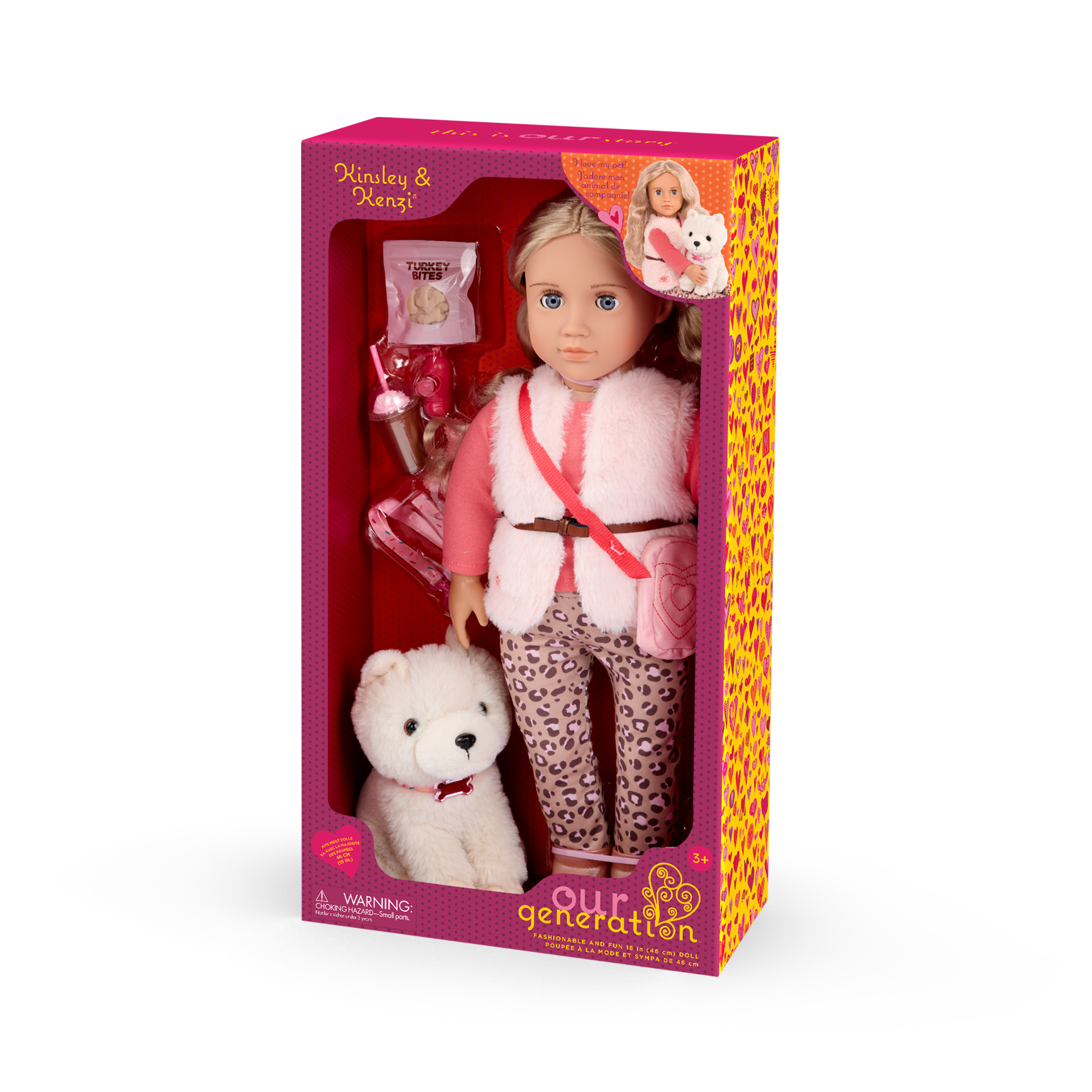 - 18-inch Doll & Pet Puppy Set: Turn every day into a paw-some adventure with Our Generation 18-inch doll Kinsley and her pet puppy Kenzi.