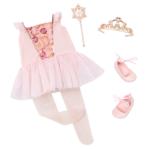 - Enchanting Style: Lalia arrives with a charming ballet dress decorated in sequin details, a golden tiara, a snowflake-themed wand, a pair of tights, and ballet shoes.