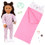 - Includes: 18-inch doll, a pink pajama with cute kitty prints, a pair of undies, slippers, a kitty-themed sleeping bag, a bowl of popcorn, 2 cookies, a glass of chocolate milk, 2 bottles of pretend nail polish, and a full face mask with 2 cucumber slices.