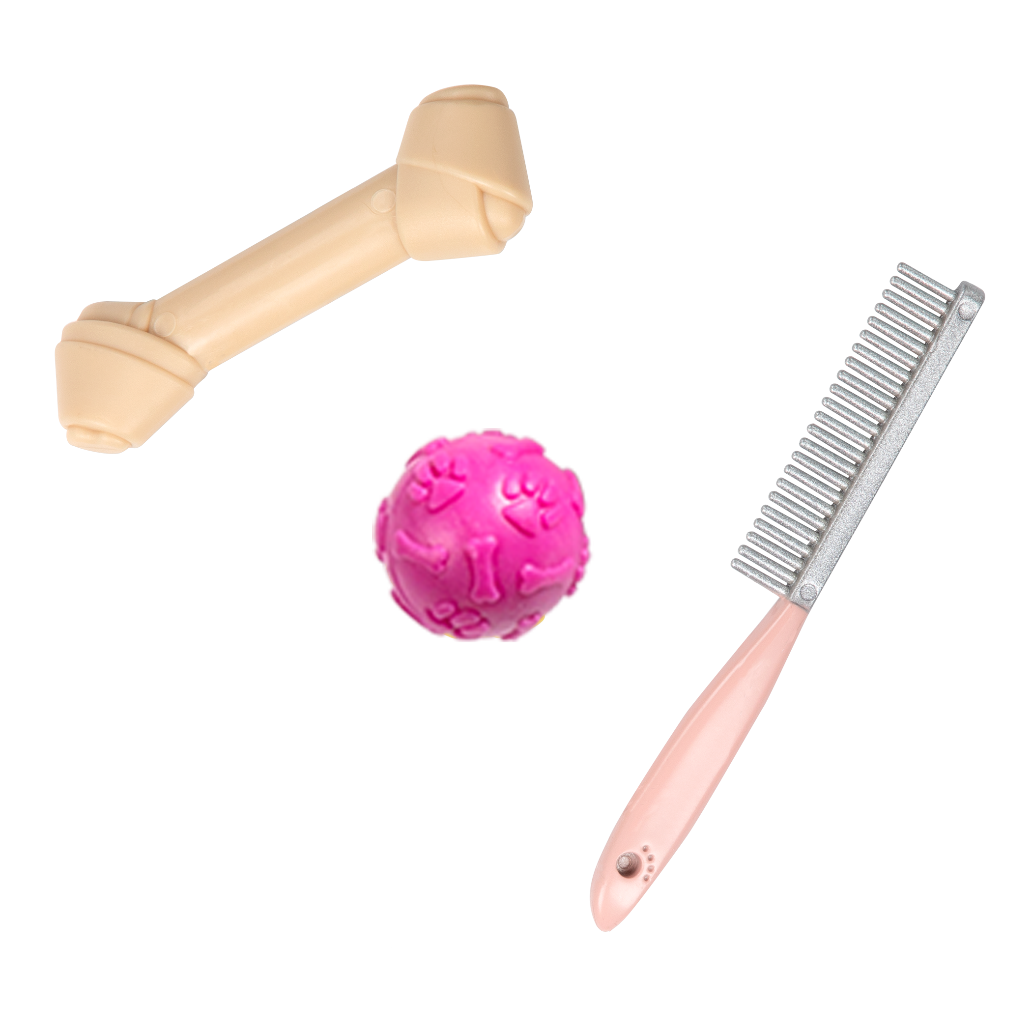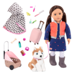 • Includes: 18-inch doll, 6-inch plush puppy, hooded poncho, luggage, rolling pet carrier, and travel accessories.