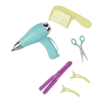 - Includes: salon chair, hair dryer, pretend flat iron, scissors, 2 hair clips, and a comb.