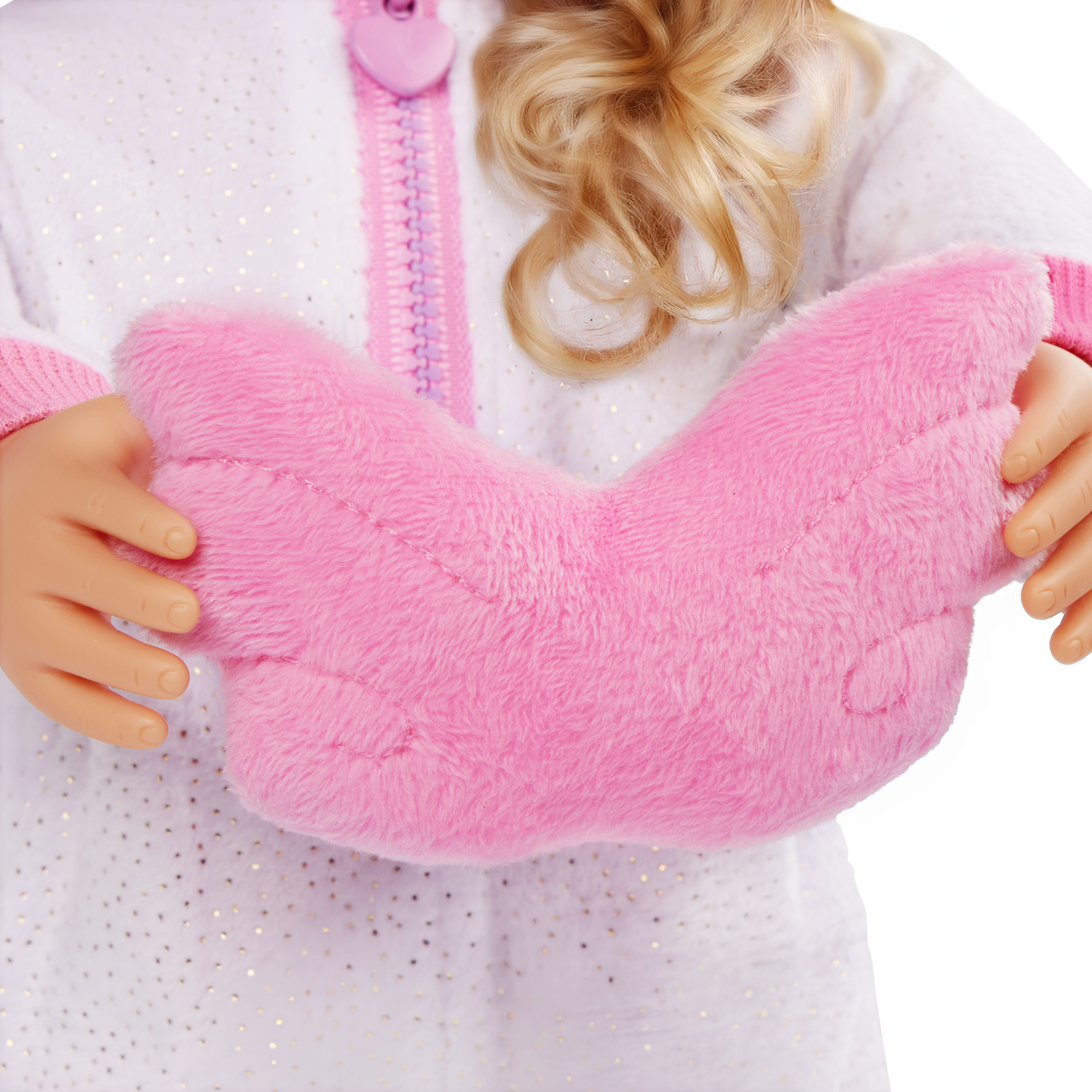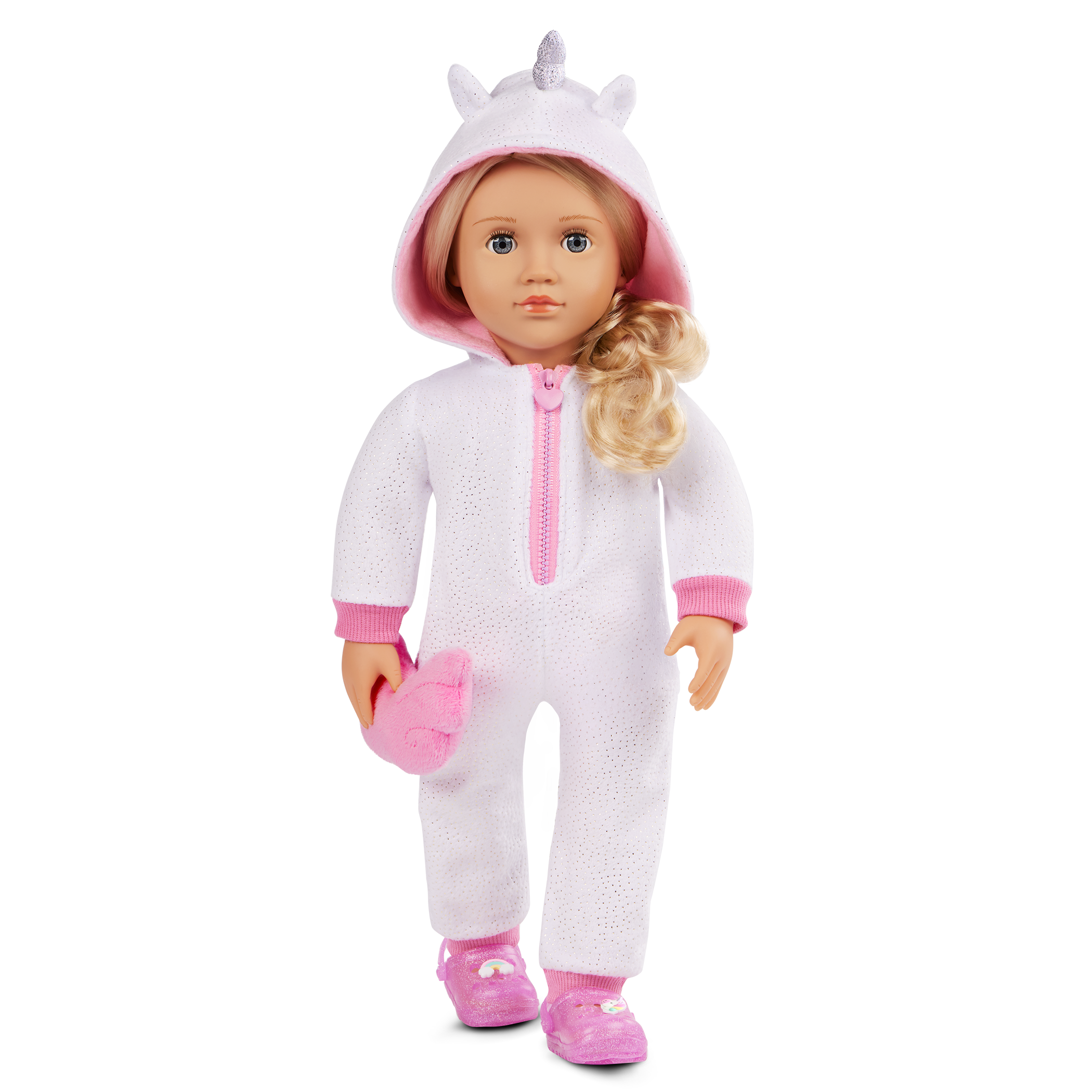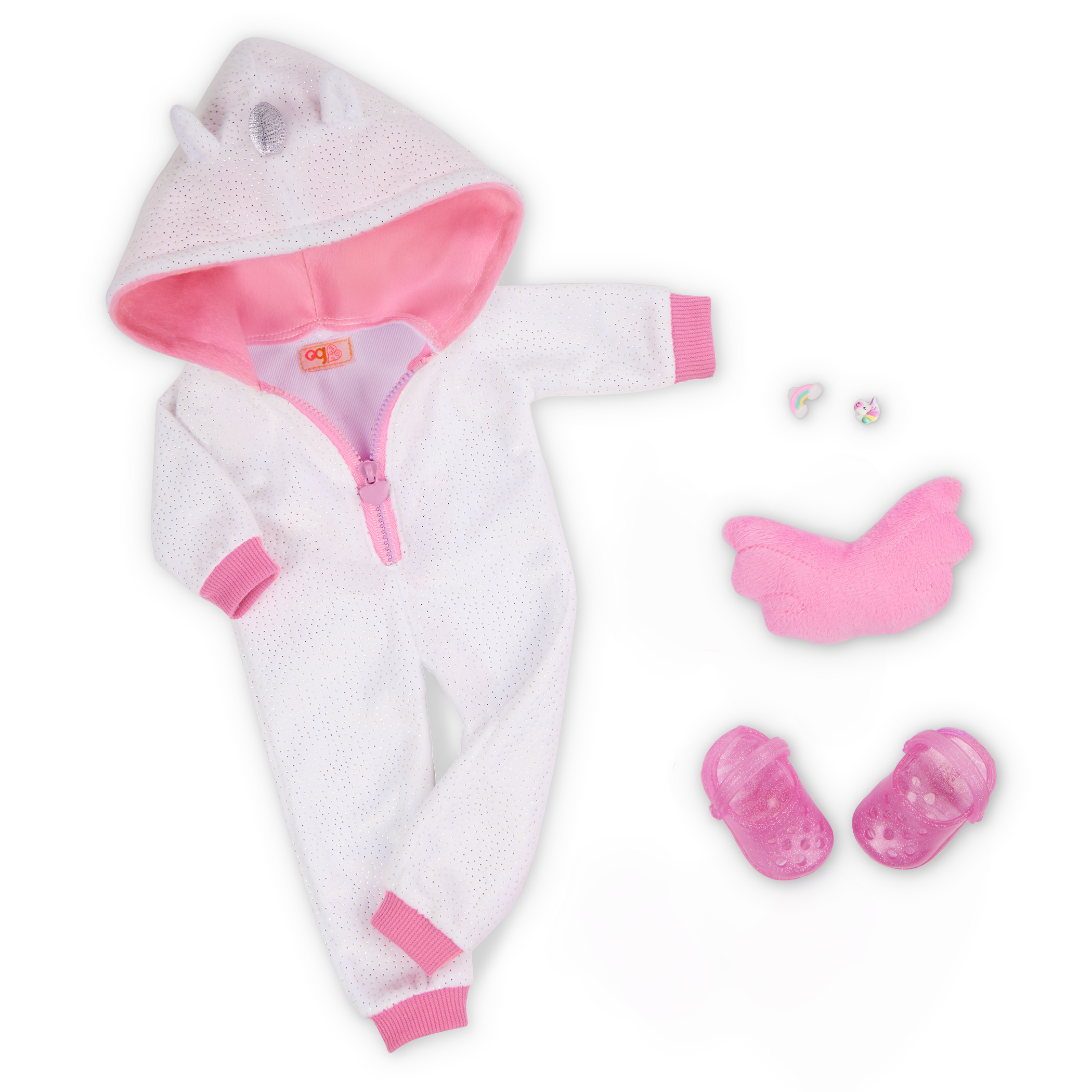 - Child-Friendly Style: Lilian wears a zip-up unicorn-themed pajama onesie and comes with a wing-shaped plush pillow, a pair of undies, and shoes with rainbow and unicorn shoe charms.