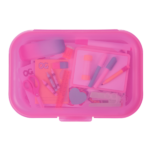 - Includes: A pink storage case, a dry-erase board with marker, 2 markers, a pair of scissors, a glue stick, a notepad, a pretend stapler, 2 notebooks, a ruler, a pencil, an eraser, a pencil sharpener, 3 crayons, a pencil case, and 3 sheets of stickers.