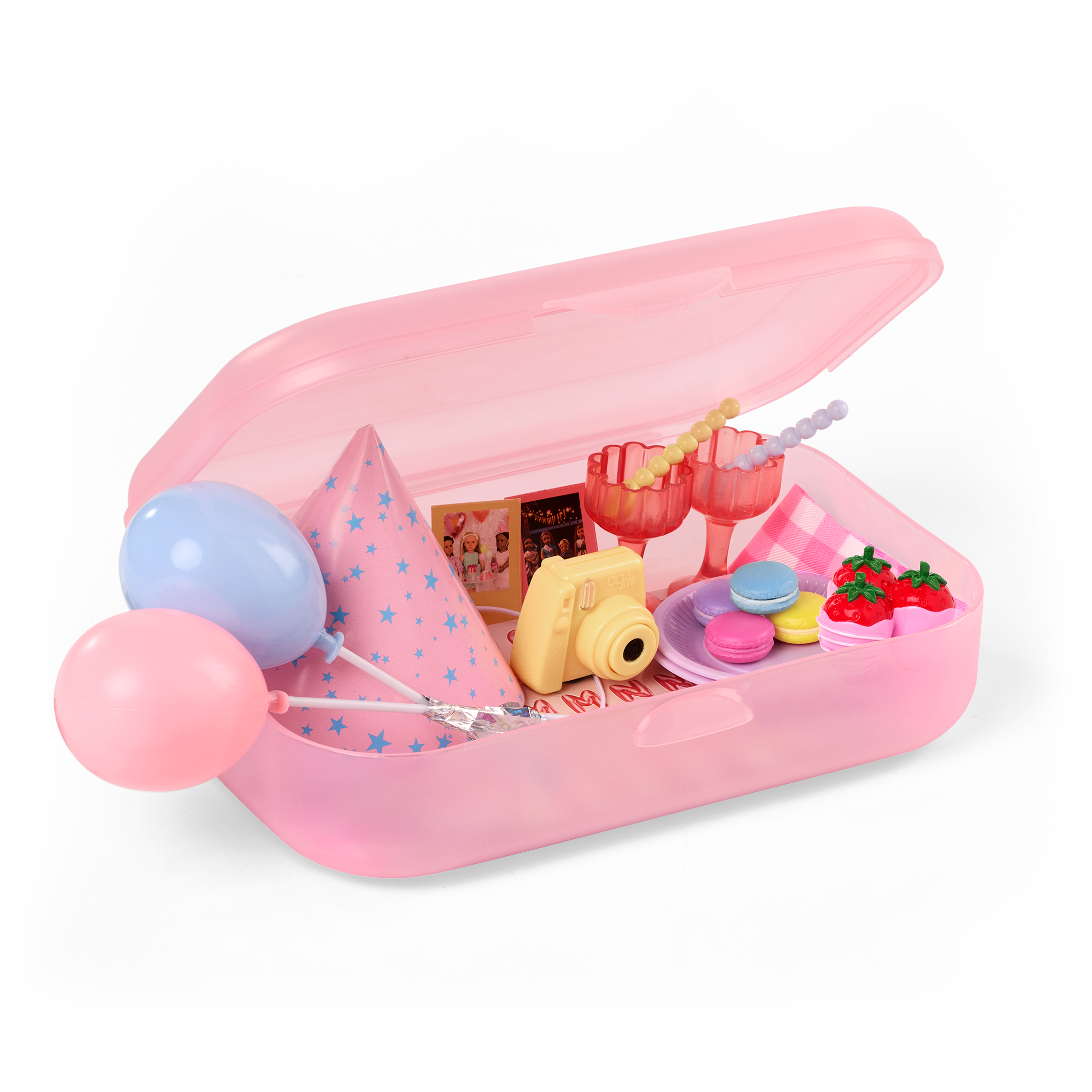 - Includes: A storage case, 2 balloons, a party hat, a pretend camera, 2 photos, a tablecloth, 2 plates, 2 cups, 2 spoons, a strawberry cluster, 4 macarons, and 2 sticker sheets.