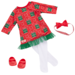 - Festive Fashion: Luz arrives wearing a playful Christmas sweater dress decorated in a present pattern. She also comes with a pair of tights, undies, a large red bow headband, and shoes with cute bow details.