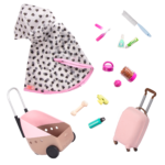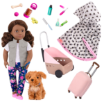 - Includes: 18-inch doll, 6-inch plush puppy, hooded poncho, luggage, rolling pet carrier, and travel accessories.