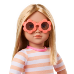 - Child-Friendly Fashion: Margot wears a sporty swimsuit with cute stripes and a pink frilly waist, floral sunglasses, and peep-toe sandals. She also comes with a popsicle-themed pool float that kids can really inflate!