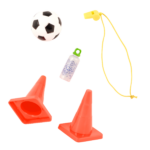 - Uniform & Accessories: Includes a light-blue jersey with the number “”8″” and team patch, black shorts, yellow cleats, shin protectors, tall socks, a pair of undies, a soccer ball, 2 training cones, a whistle, and a water bottle.