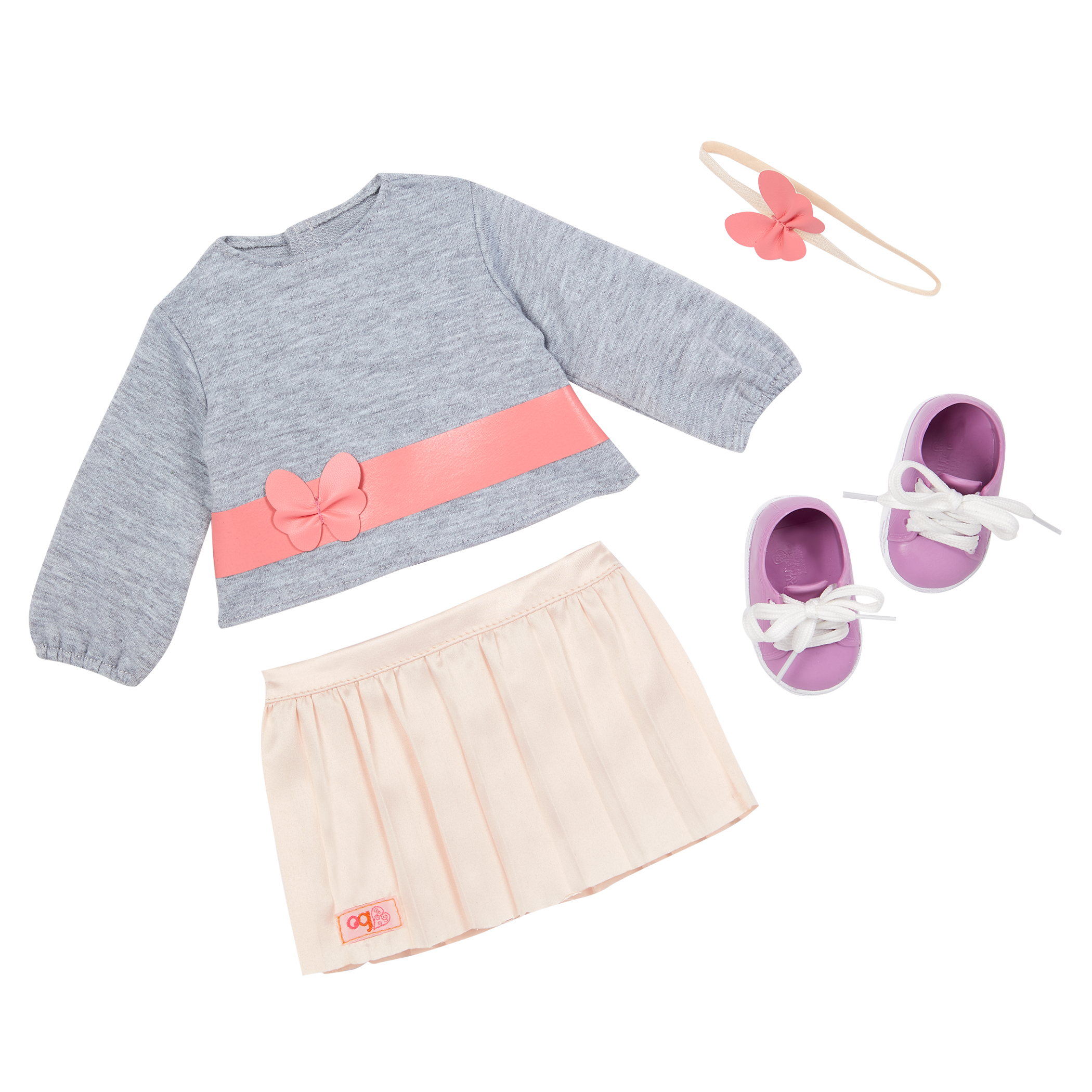 - Includes: doll, sweater decorated with a cute butterfly waist belt, pleated skirt, pair of undies, butterfly headband, and running shoes with real laces to tie.
