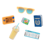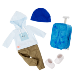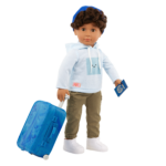 - Includes: 18-inch boy doll, beanie hat, graphic hooded top, cargo-style pants, pair of undies, shoes, rolling luggage with an adjustable handle, sunglasses, passport, boarding pass, smoothie, pack of gum, and a pretend video game console.