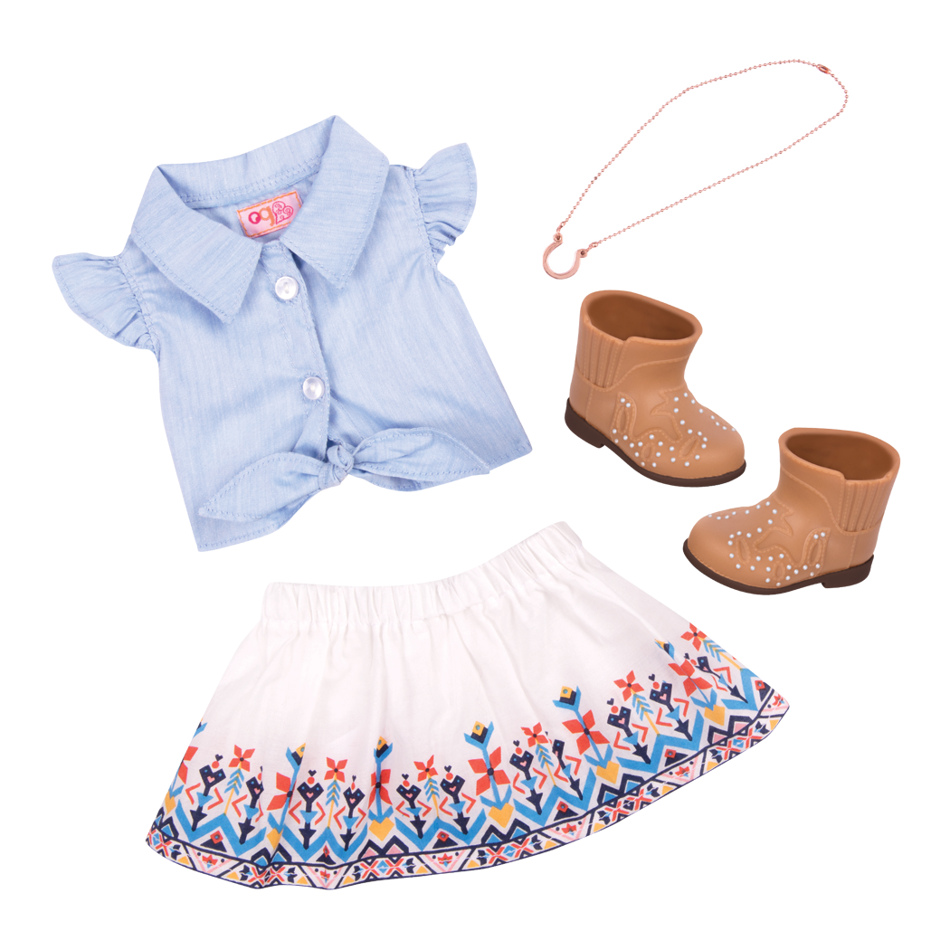 You'll start a style stampede in the Our Generation My Lucky Horseshoe outfit for 18-inch dolls! This western-style outfit features a blue denim shirt with buttons, ruffle sleeves, and a tie waist as an extra pretty touch. The flowing skirt with beautiful desert-style embroidery will make your 18-inch dolls want to twirl around for hours! For style that’s just as perfect on city streets as it is in sand and fields, your doll can wear the desert boots with extra glimmer. Don’t forget the lucky horseshoe necklace to show your bestie's love for horses! (Dolls sold separately)
