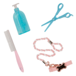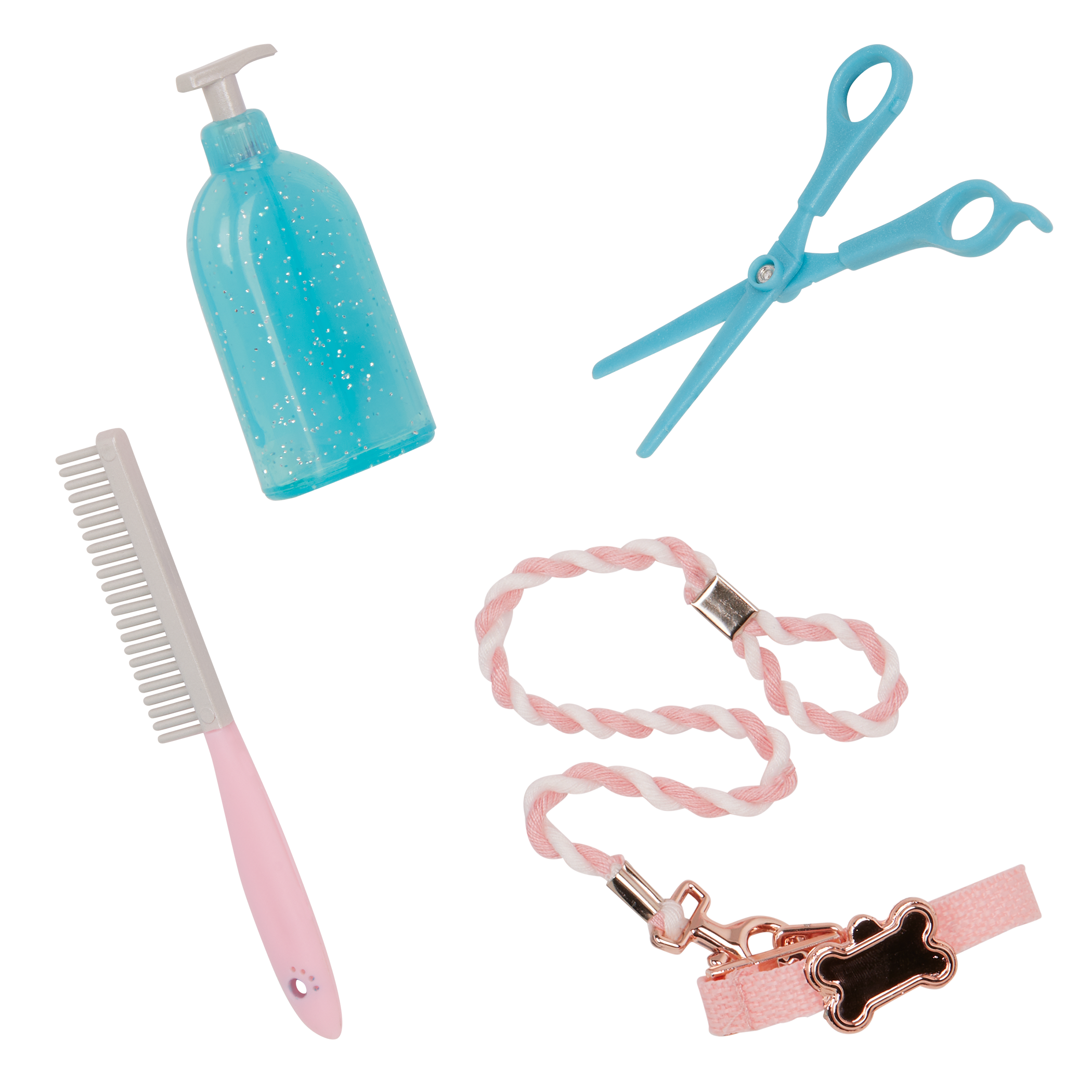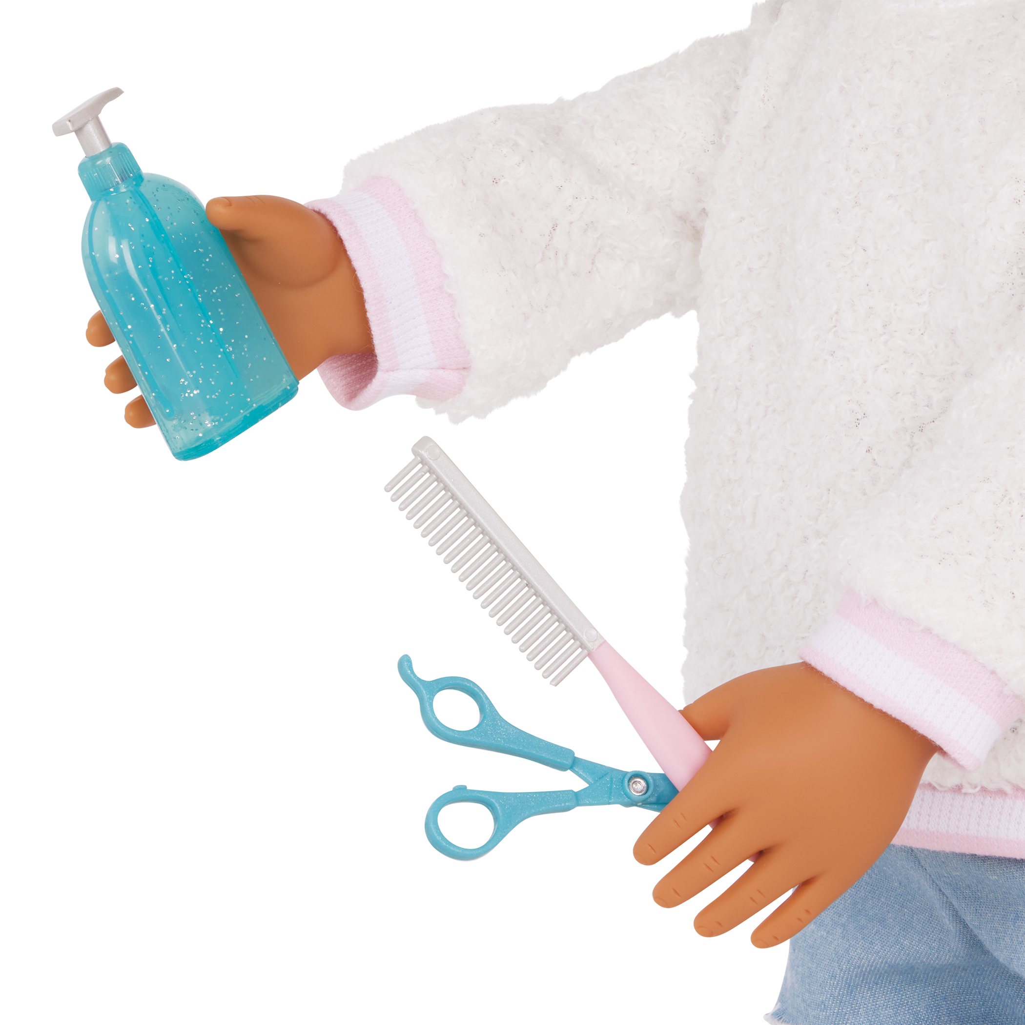 - Includes: Doll, a fuzzy faux-fur sweater, distressed denim-style pants, a pair of undies, 2 sparkly hair bows, shoes, pretend scissors, shampoo bottle, 6-inch Saluki dog plush, dog collar, leash, and a comb.