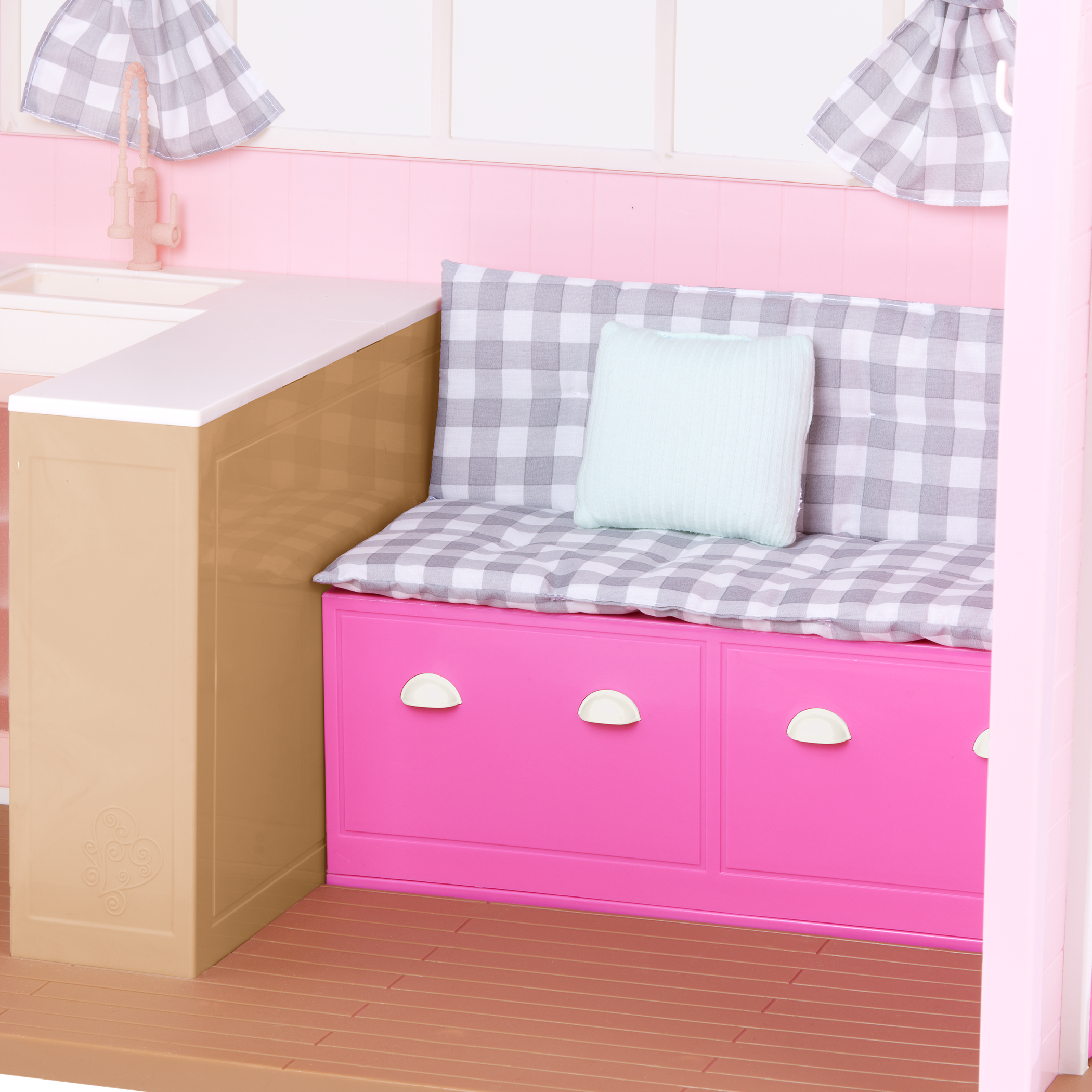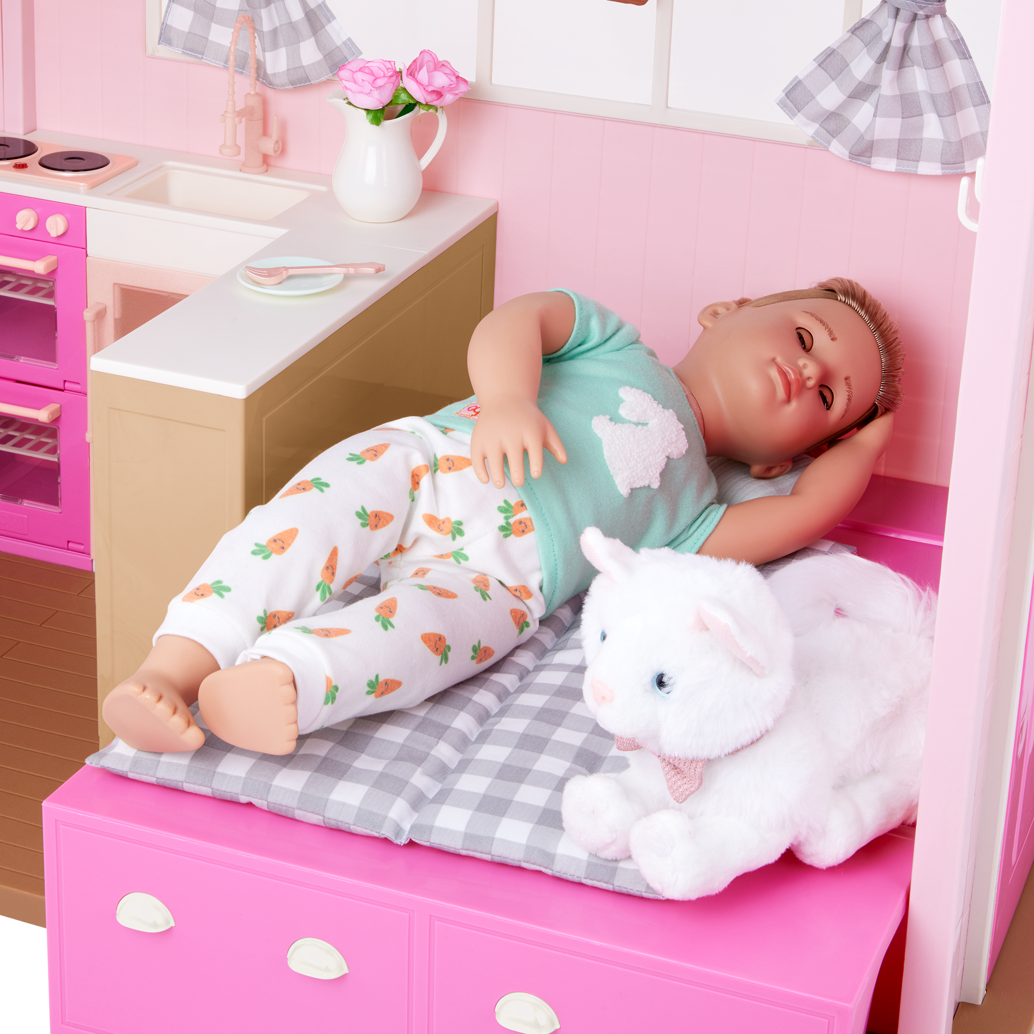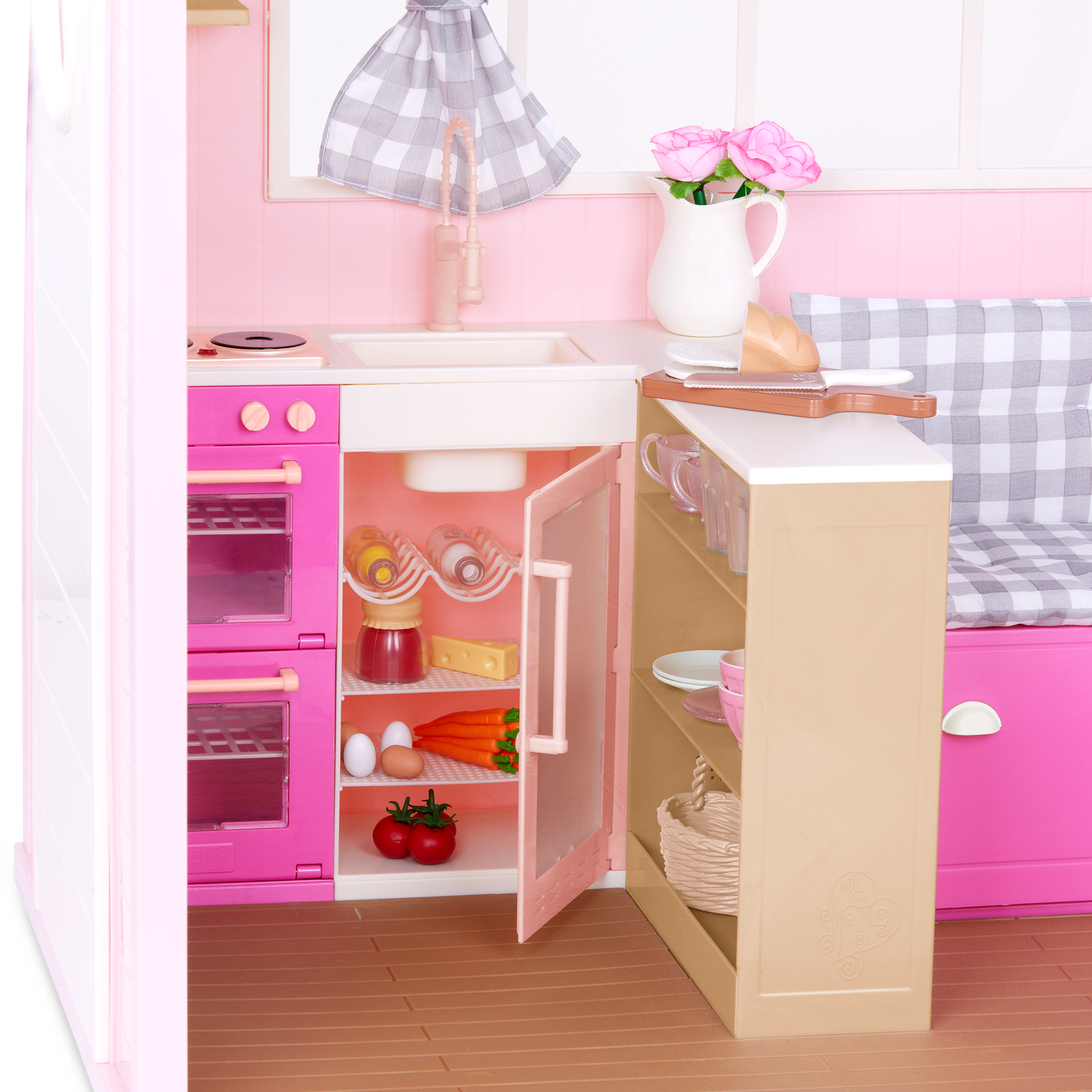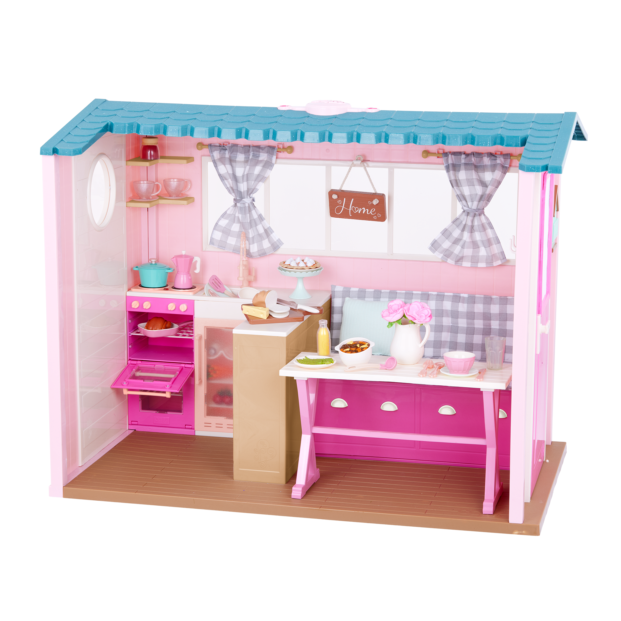 - Includes: A country home with animal sounds, a bench cushion and pillow, 2 plaid curtains with rods, a home sign, a vase, 2 flowers, a basket, 30+ kitchen items, and 15+ play food accessories.
