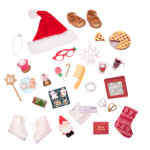 - Includes: Santa hat, stocking, snow globe, sticker sheet, 4 ornaments, gnome, letter, envelope, holiday card, candle with holder, wand, bracelet, necklace, 2 hair clips, 2 combs, glasses, skates, shoes, plate, tray, and 9 play food treats.