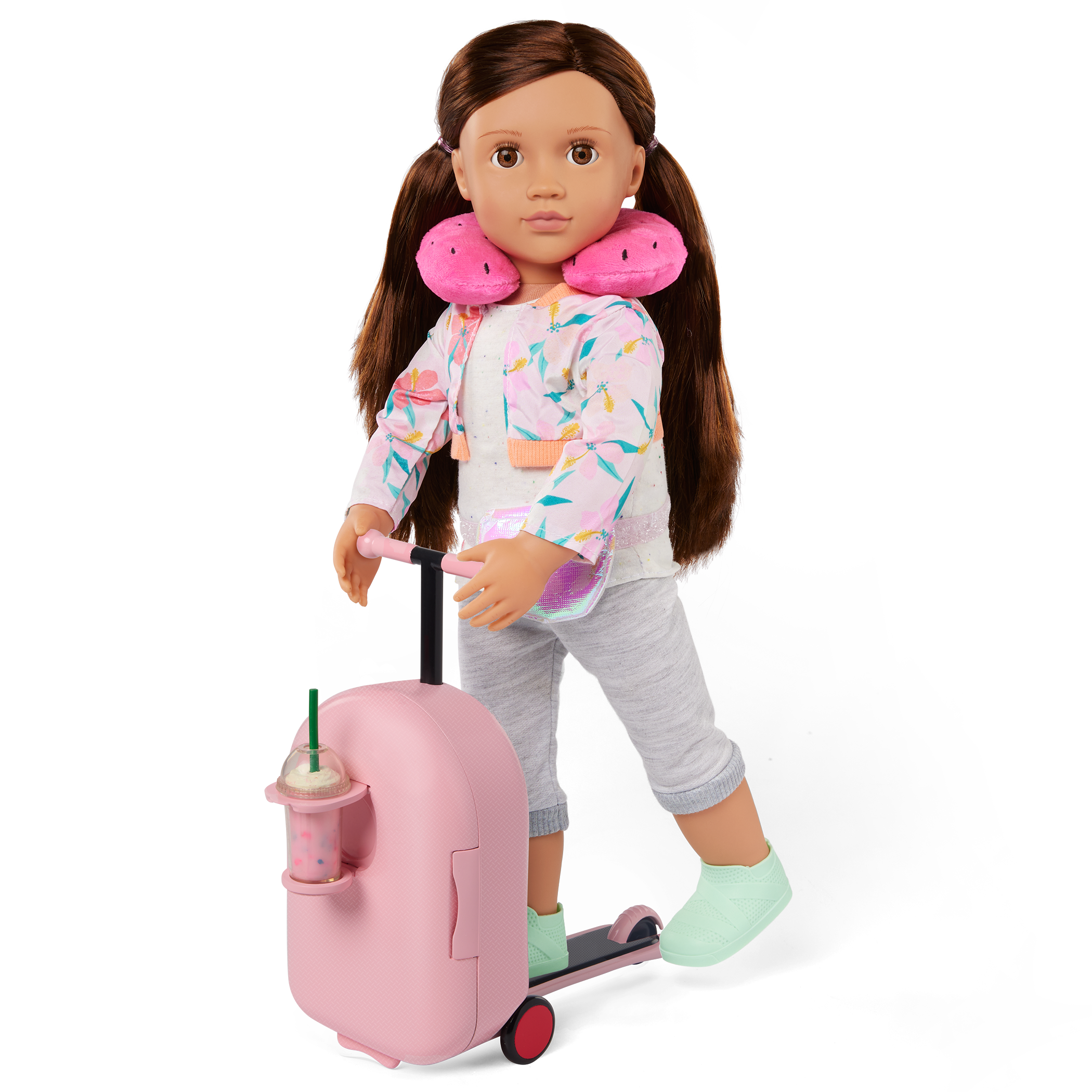• Scooter Suitcase: This trendy pink doll luggage has a built-in scooter with rolling wheels so kids can play out travel stories like never before. It also has an extendable handle and mini cupholder!