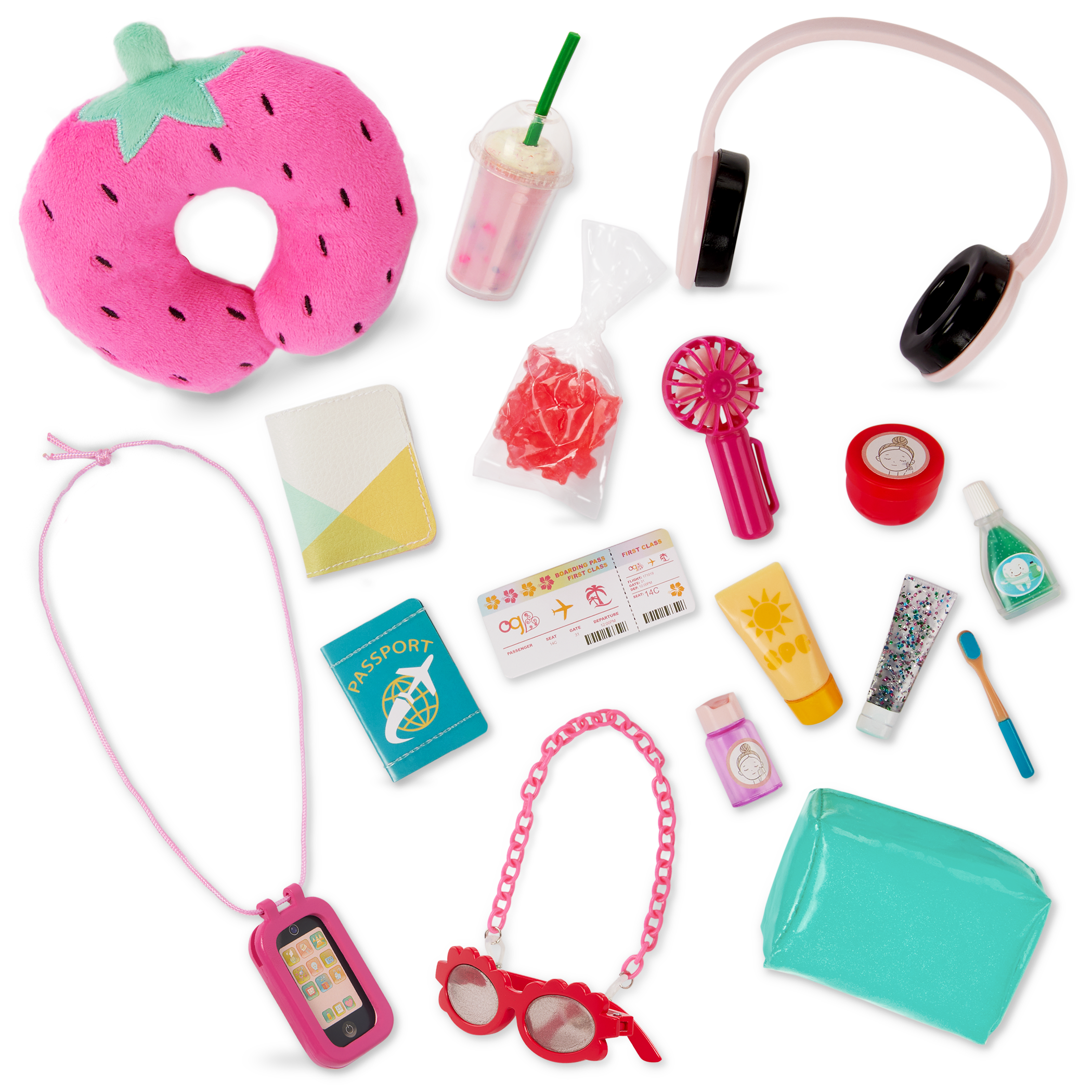 • Includes: Scooter suitcase, travel pillow, headphones, handheld fan, cellphone with case, sunglasses, passport with holder, boarding pass, candy bag, drink, toiletry bag, mouthwash, toothpaste, toothbrush, bottle of toning cream, sunscreen, and eye cream.