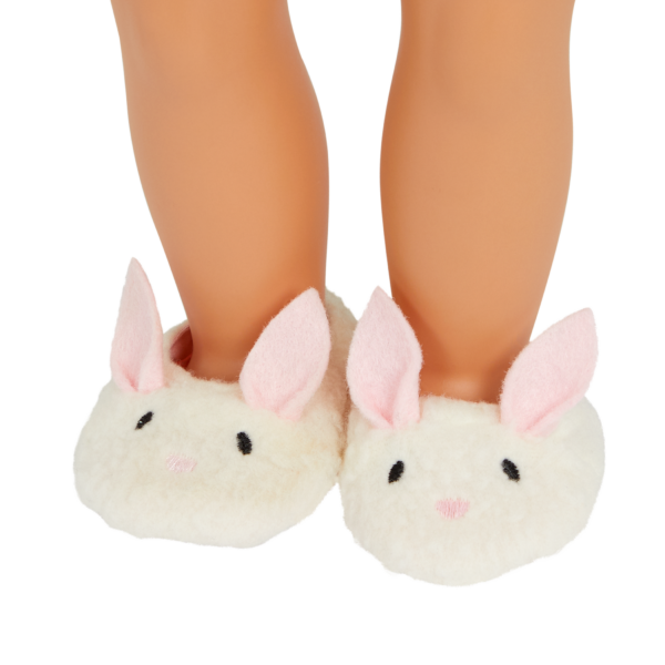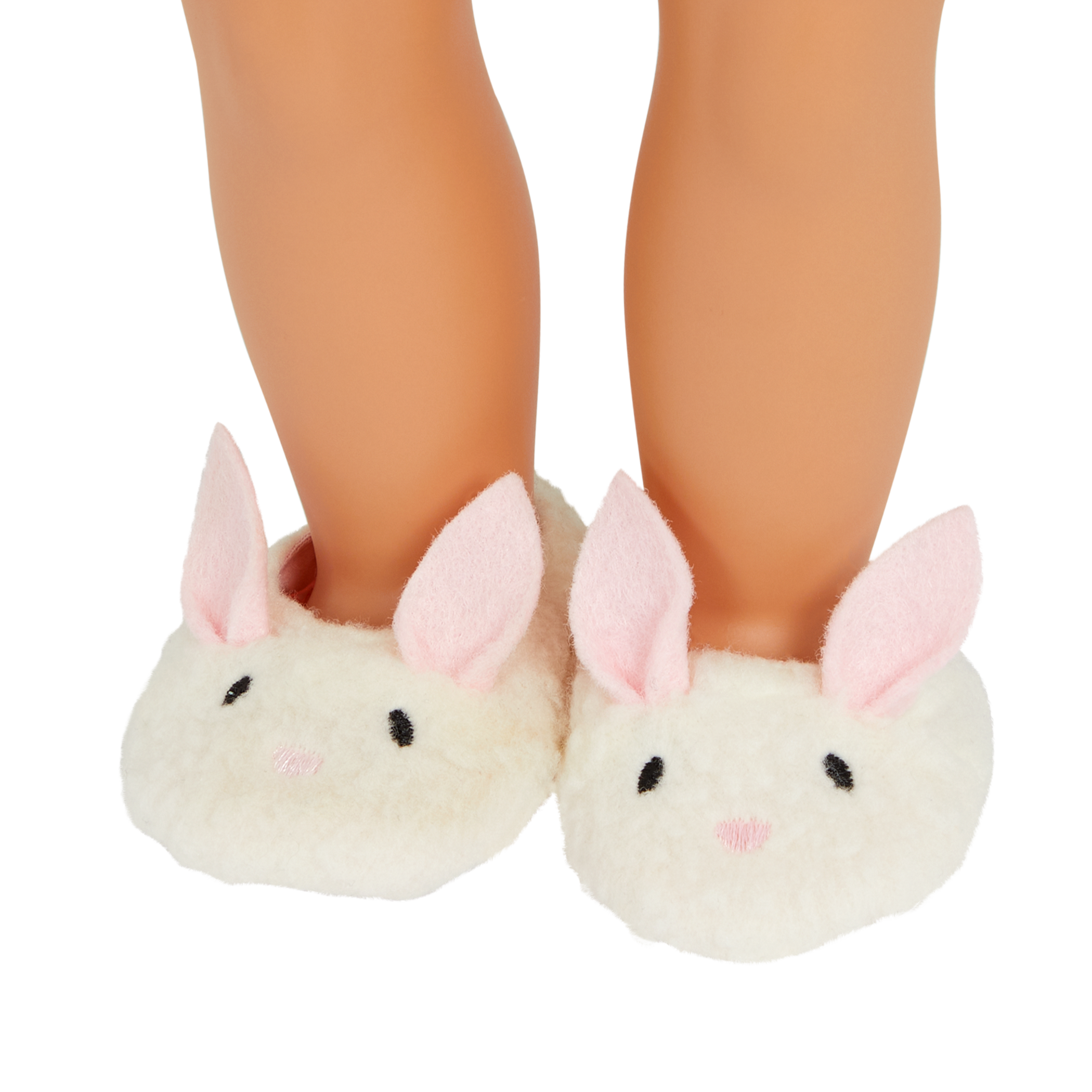 - Includes: A pink pajama top with a matching pair of bloomers, mini plush doll, and bunny slippers.