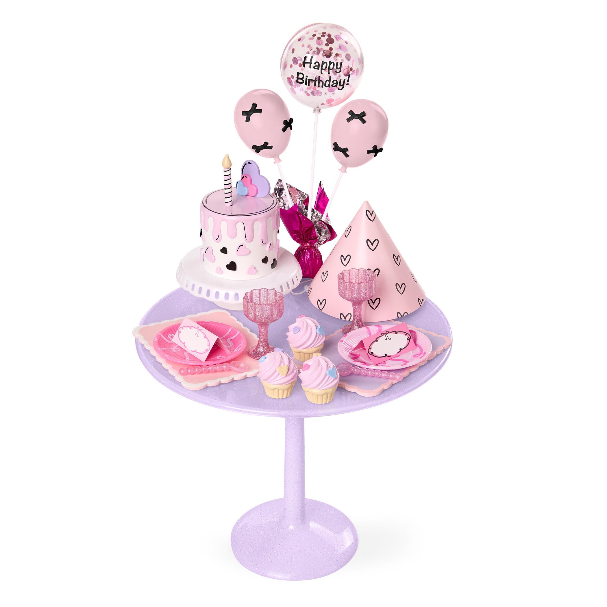 - What’s Included: A party table with a glittery tabletop, birthday cake with a removable cake topper and candle, 3 cupcakes, birthday hat, 3 balloons, balloon stand with foil paper, cake stand, 2 place cards, 2 place mats, 2 plates, 2 cups, and 2 spoons.