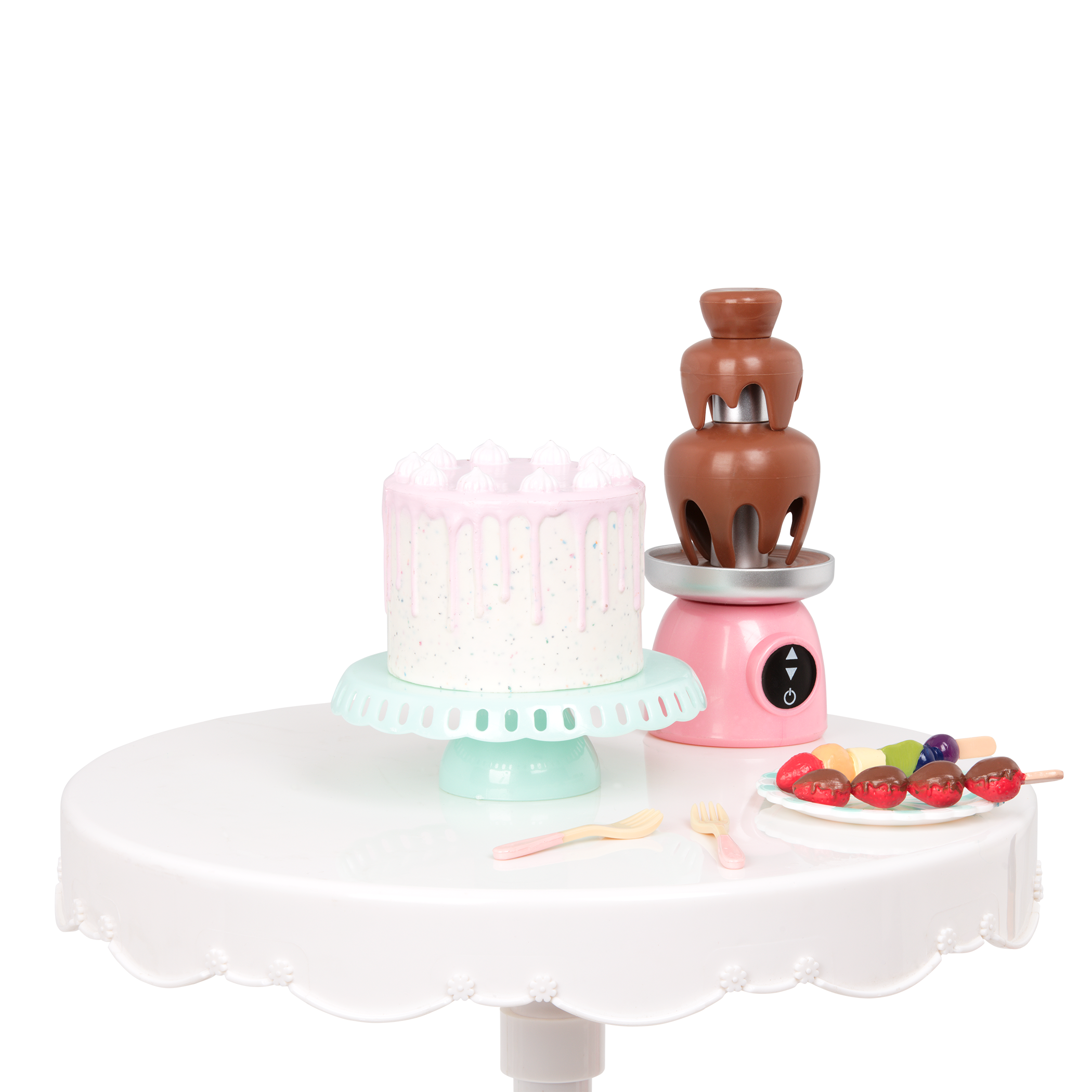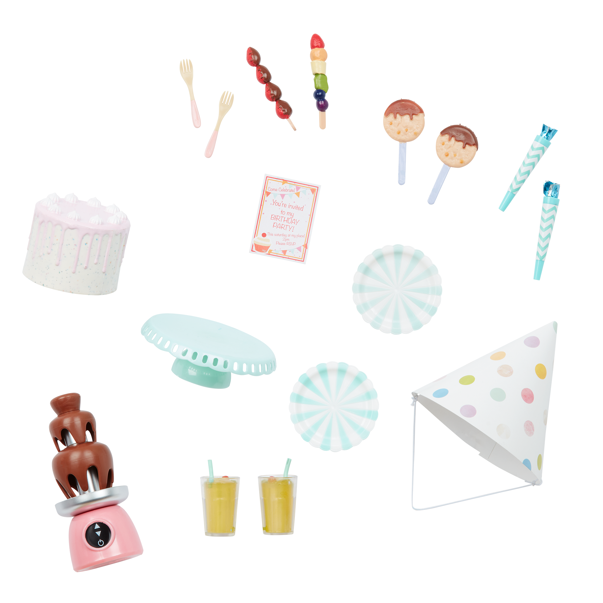 • Includes: Party table, chocolate fountain, birthday cake, 2 party horns, gift bag, party hat, invitation card, cake stand, strawberry and fruit skewers, 2 plates, 2 glasses, 2 forks, and 2 cookies.