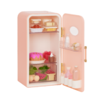 - Includes: 2 removable shelves and drawer, lettuce, beet, 3 containers, 4 lids, butter dish, milk, Bundt cake with slice, dish, chicken, 6 eggs, bowl, strawberry juice, pudding cup, raspberries, watermelon slice, peach cluster, soda, and dessert bowl.
