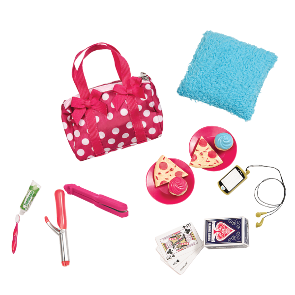- Includes: sleeping bag, duffle bag, 2 pizza slices, 2 cupcakes, 2 dishes, pretend straightening and curling irons, phone, toothbrush, toothpaste, pillow, and playing card deck.