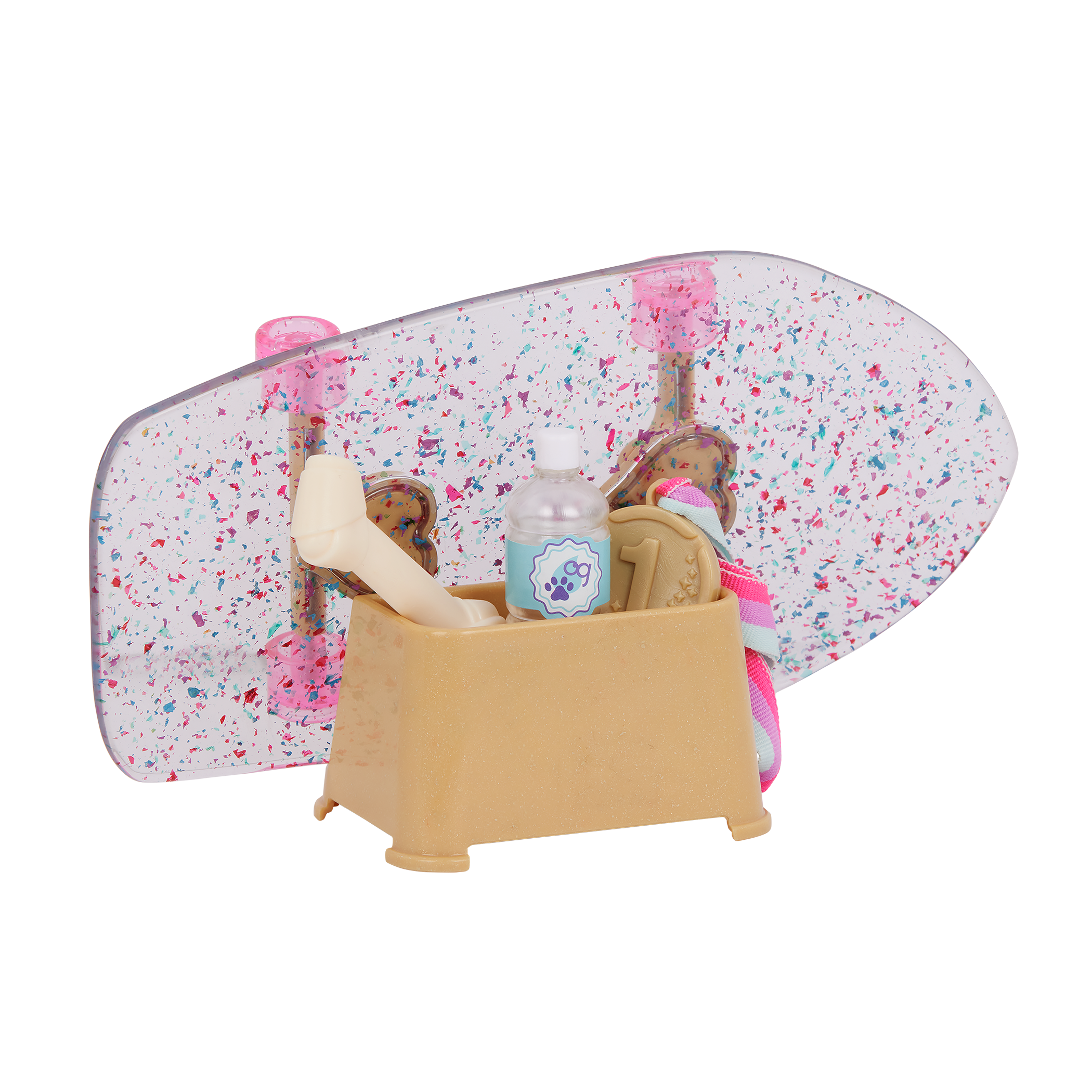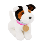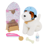 Zoom into fun with the Our Generation 6-inch Pro Skater Pup! More than a friendly pet, this Parson Russell Terrier dog plush has bendable legs to sit, shake paws, and perform cool tricks on the skateboard to earn the gold medal! Keep your loyal pal safe with the helmet as you zip around the neighborhood. And when it's time to "paws" for a treat, park the skateboard in the stand to enjoy a sip of water. Then play the ultimate game of fetch with the bone accessory! This interactive set helps encourage outdoor play and lets animal lovers explore their favorite adventures with a pet by their side. (Dolls sold separately)