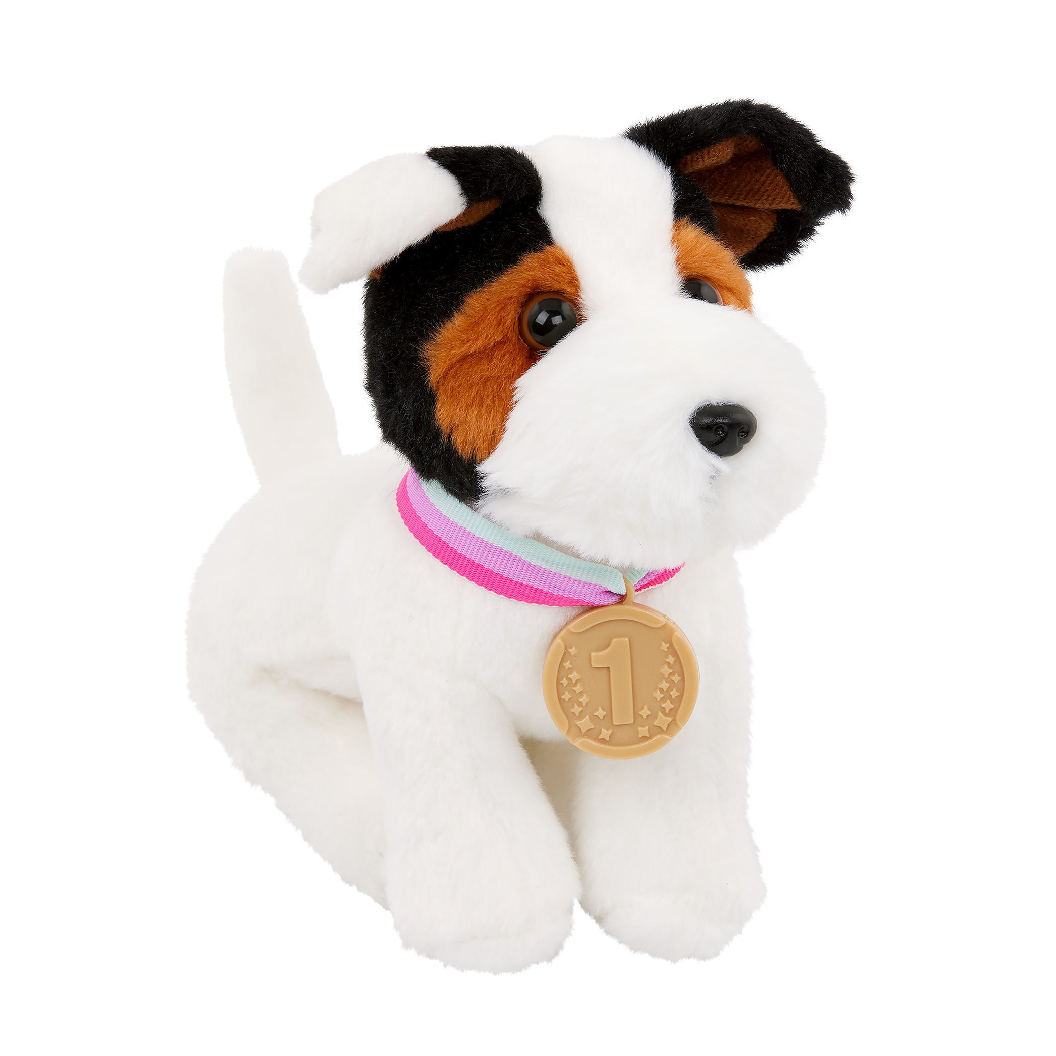 - Includes: 6-inch Parson Russell Terrier dog plush, skateboard, helmet with strap, skateboard parking block, collar, bone, winner’s medal, and water bottle.
