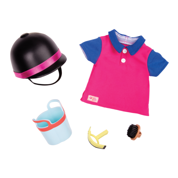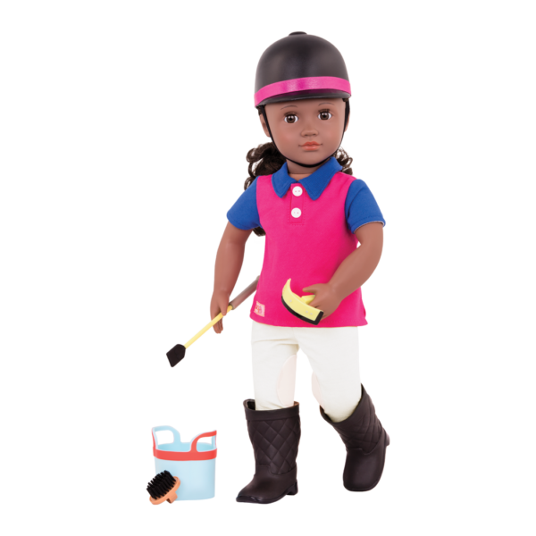 • Includes: Posable 18-inch doll, a top, formal jacket, necktie, pair of riding pants, pair of undies, tall riding boots, helmet, polo-style shirt, riding crop, horse caddy, grooming brush, horse scraper, storybook and bookmark.