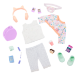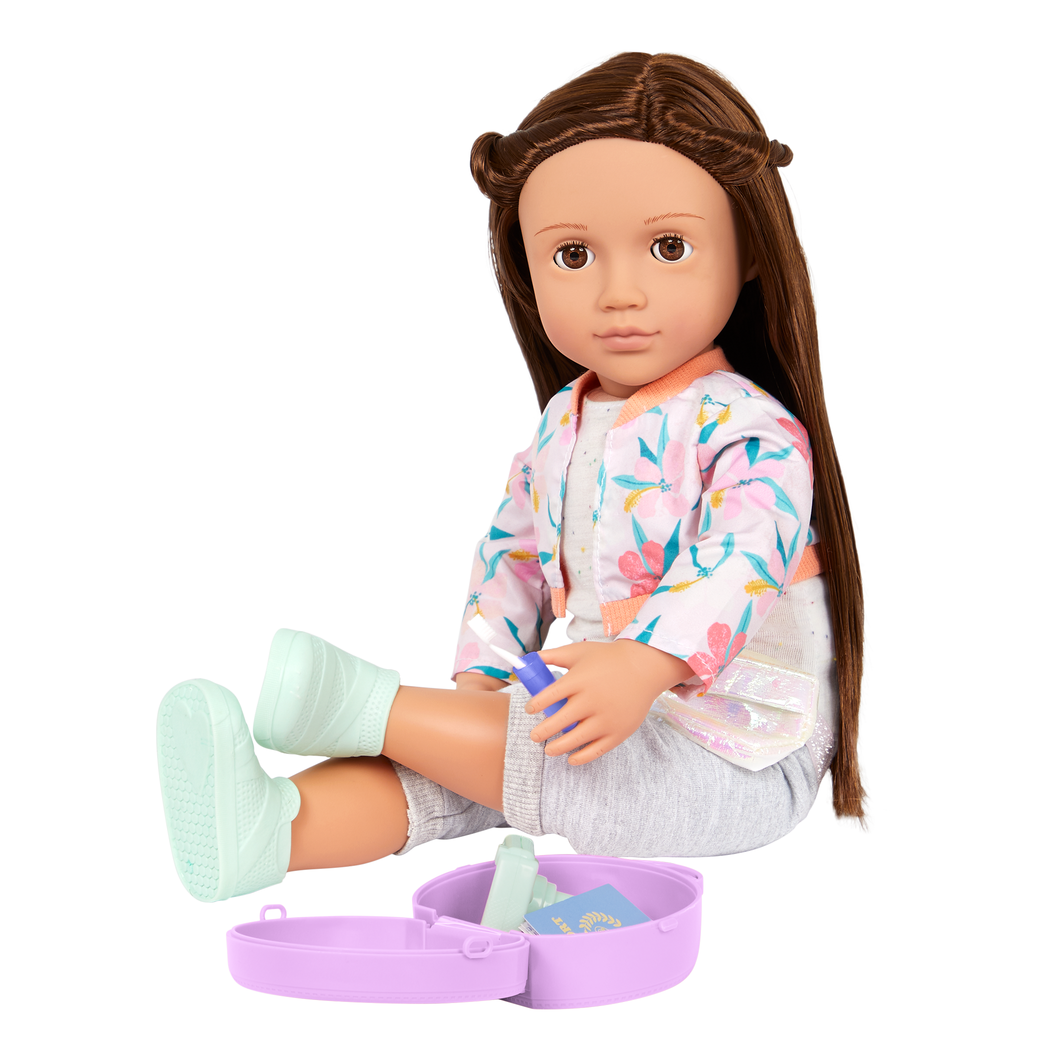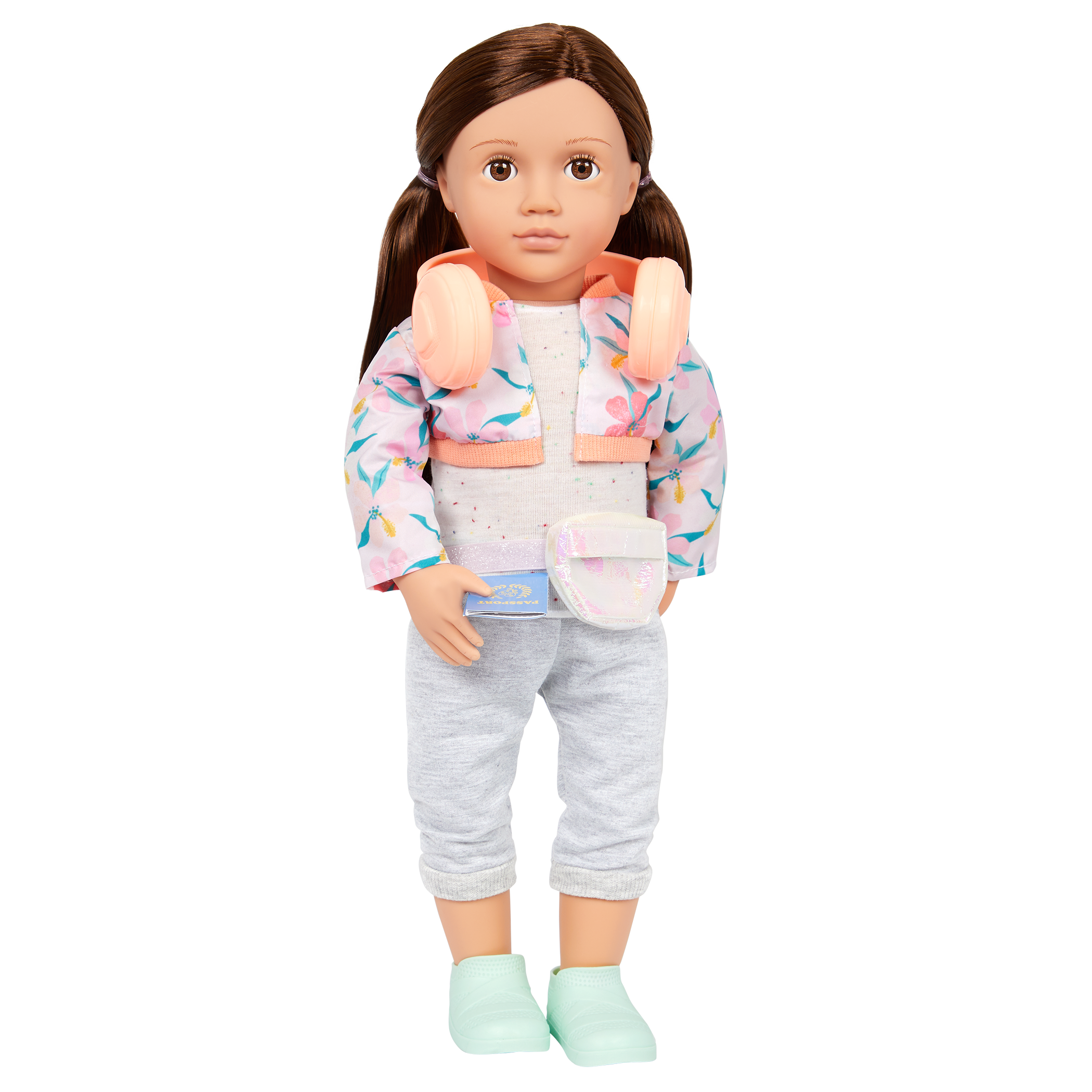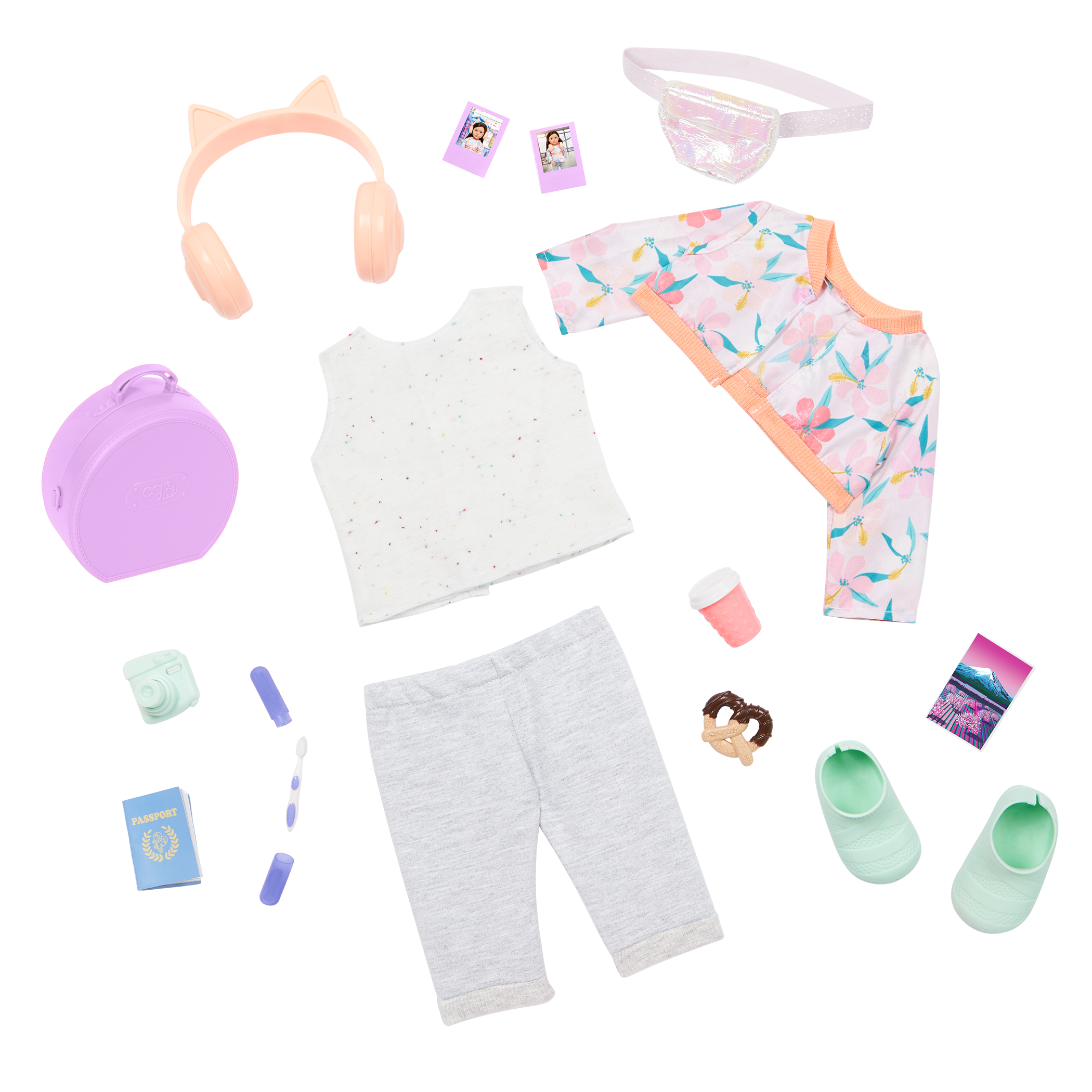 - Includes: doll, floral jacket, top, capri pants, fanny pack, a pair of undies, shoes, cat-ear headphones, camera, carry-on luggage, pretzel, toothbrush with case, OG passport, postcard, 2 photos, travel mug, storybook, and bookmark.