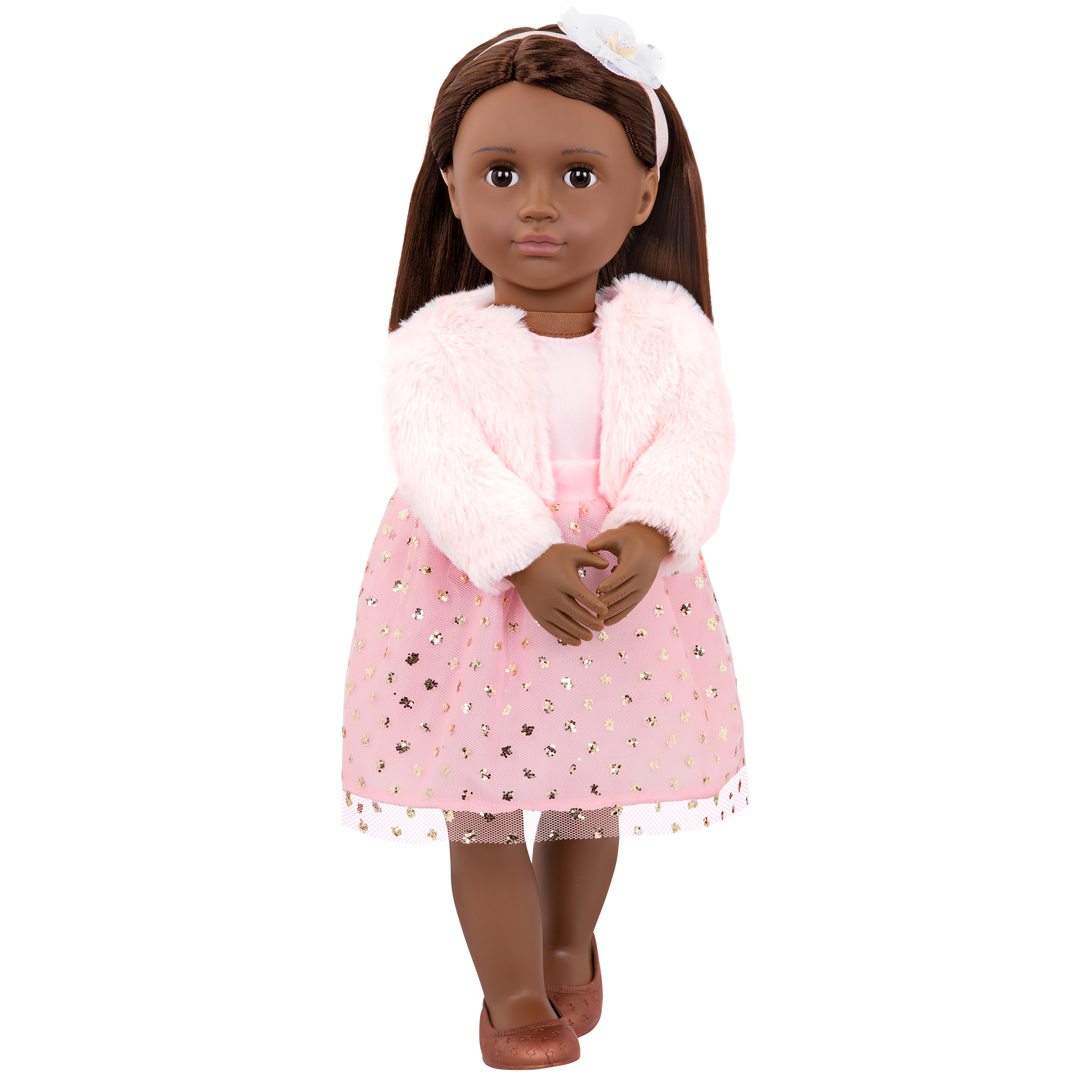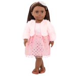 Step out in shimmering fashion with the Our Generation doll Riya! This 18-inch gal pal is all dressed up and ready for a fancy party! She has lifelike brown eyes that open and close, and her long, dark-brown hair is fun to brush and style! Her outfit is even more impressive with her own pretty pink dress, faux-fur matching coat, and adorable headband. When it’s time for dress-up, her outfit has easy-open closures to quickly put on and remove. So fashion lovers can mix, match, and create even more cute combos! Our Generation dolls make a great gift for kids ages 3+ (small parts), encouraging them to create their own unique stories.